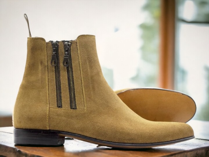 Handmade Men's Tan Suede Boot ,Ankle High Side Double Zipper Boot