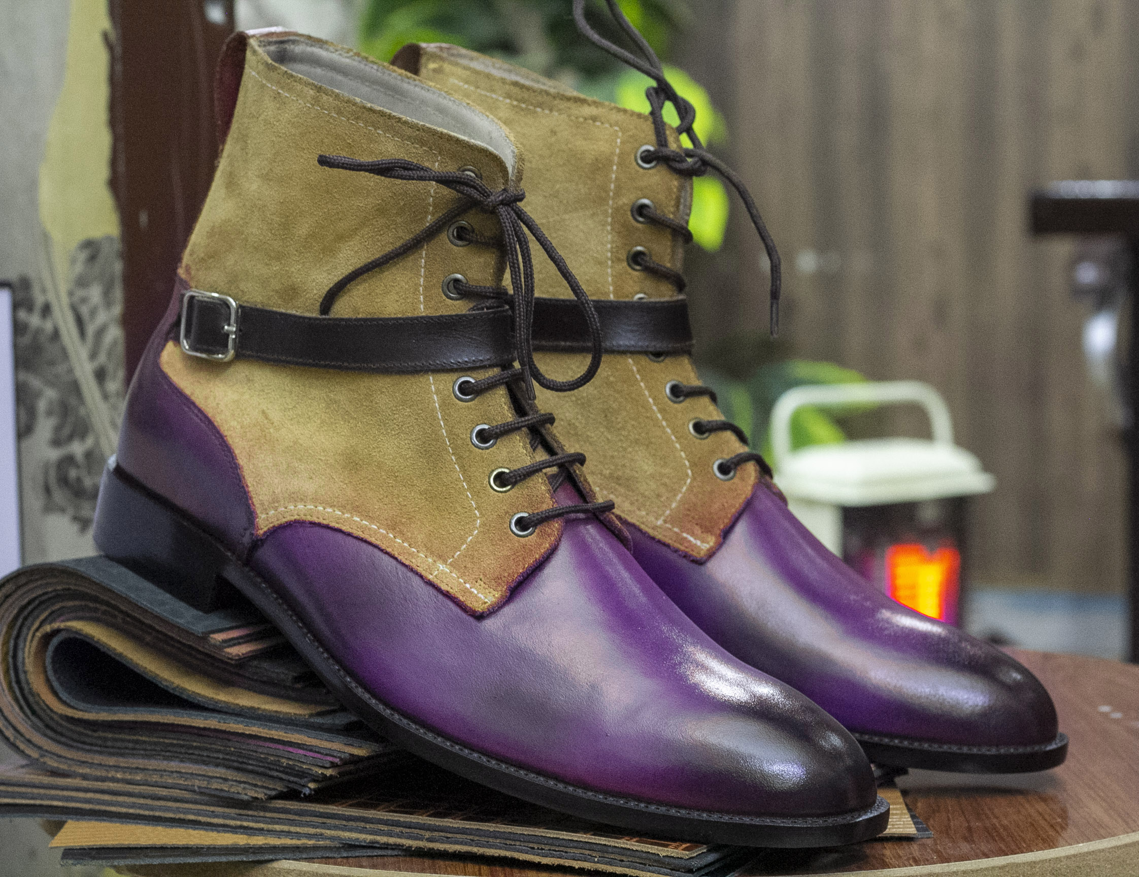 Handmade Two Tone Leather Suede Buckle Style Boot , Men's Formal Boot, Lace Up Boot