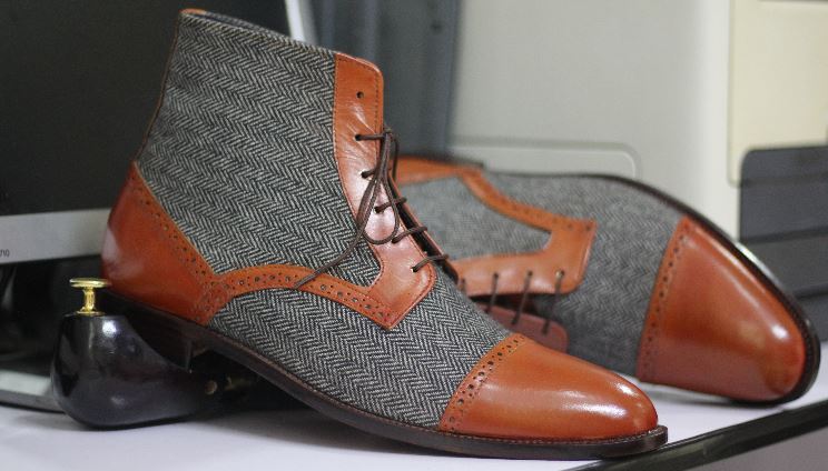 Ankle High Men's Tweed Leather & Plain Leather Boot, Handmade Two Tone Lace Up Boot