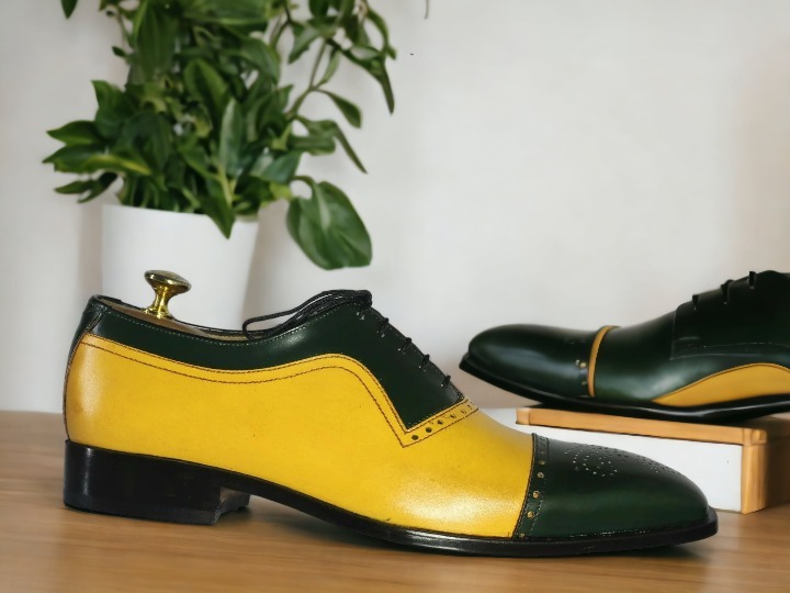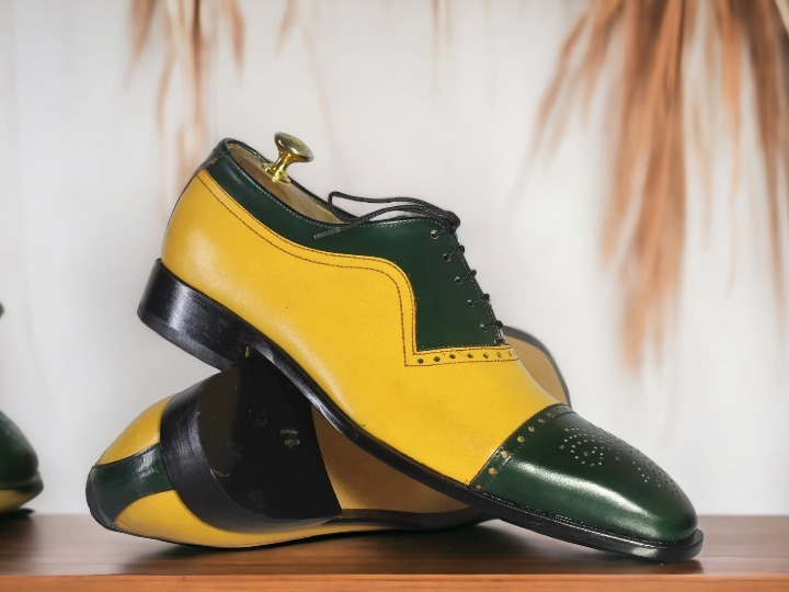 Handmade Men's Green & Mustard Shoes, Lace Up Brogue Toe, Dress Leather Shoes