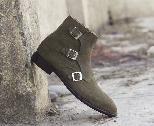 Handmade Men's Triple Buckle Monk Suede Green Ankle High Boots