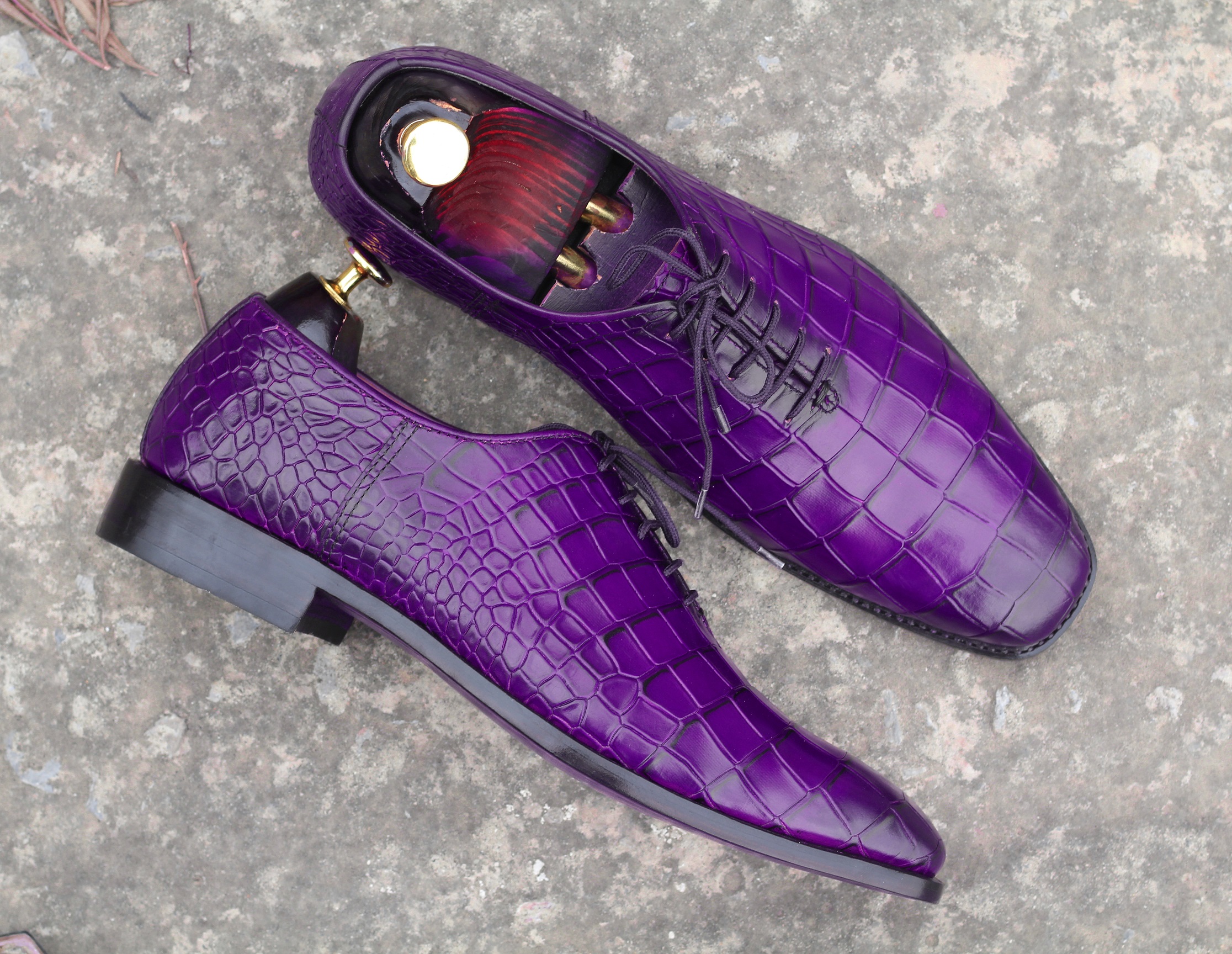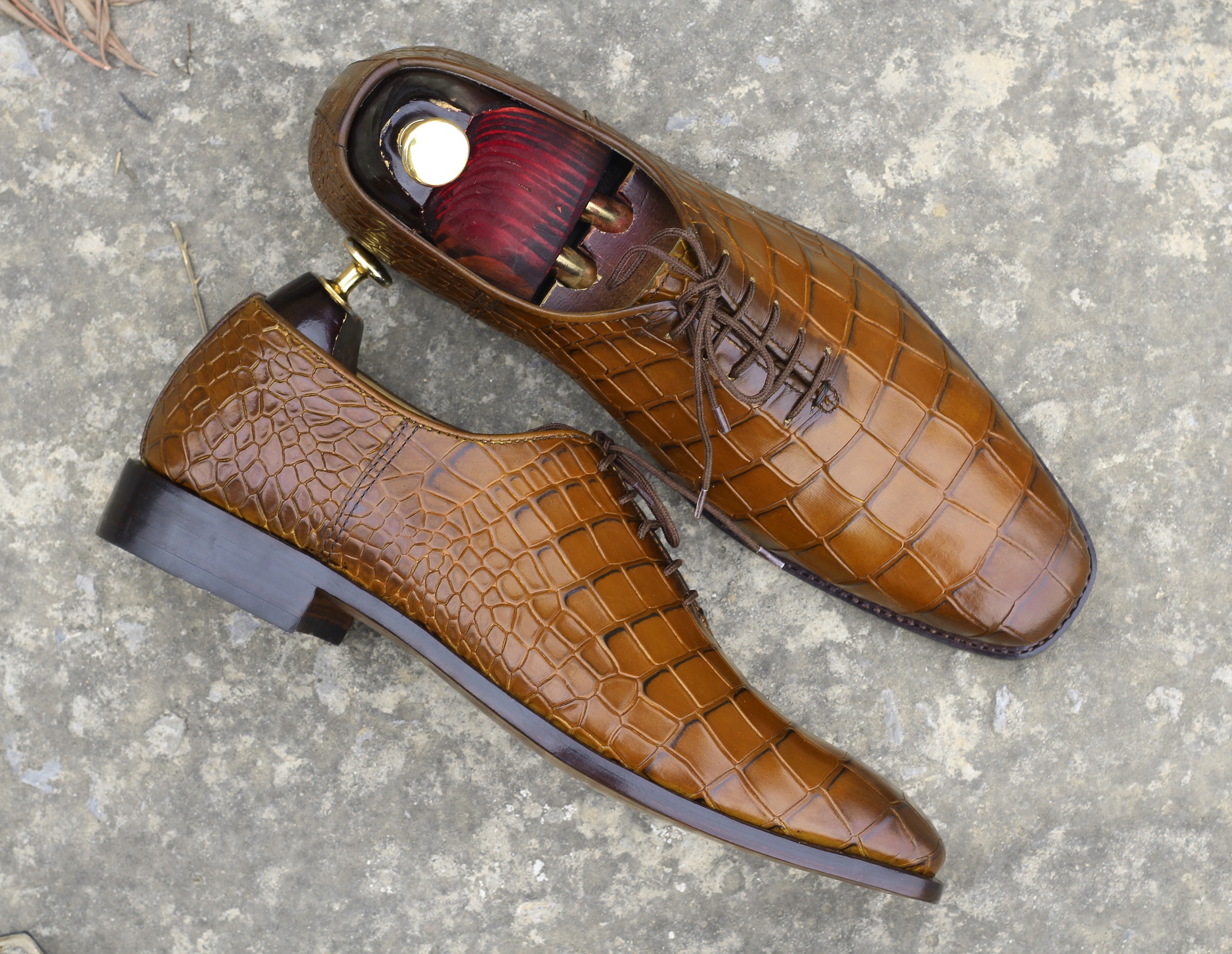 Men's Handmade Alligator Skin Texture Whole Cut Leather Lace Up Shoes