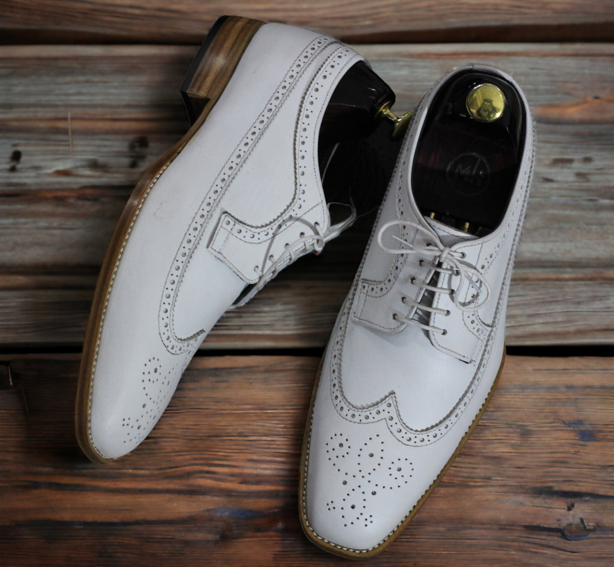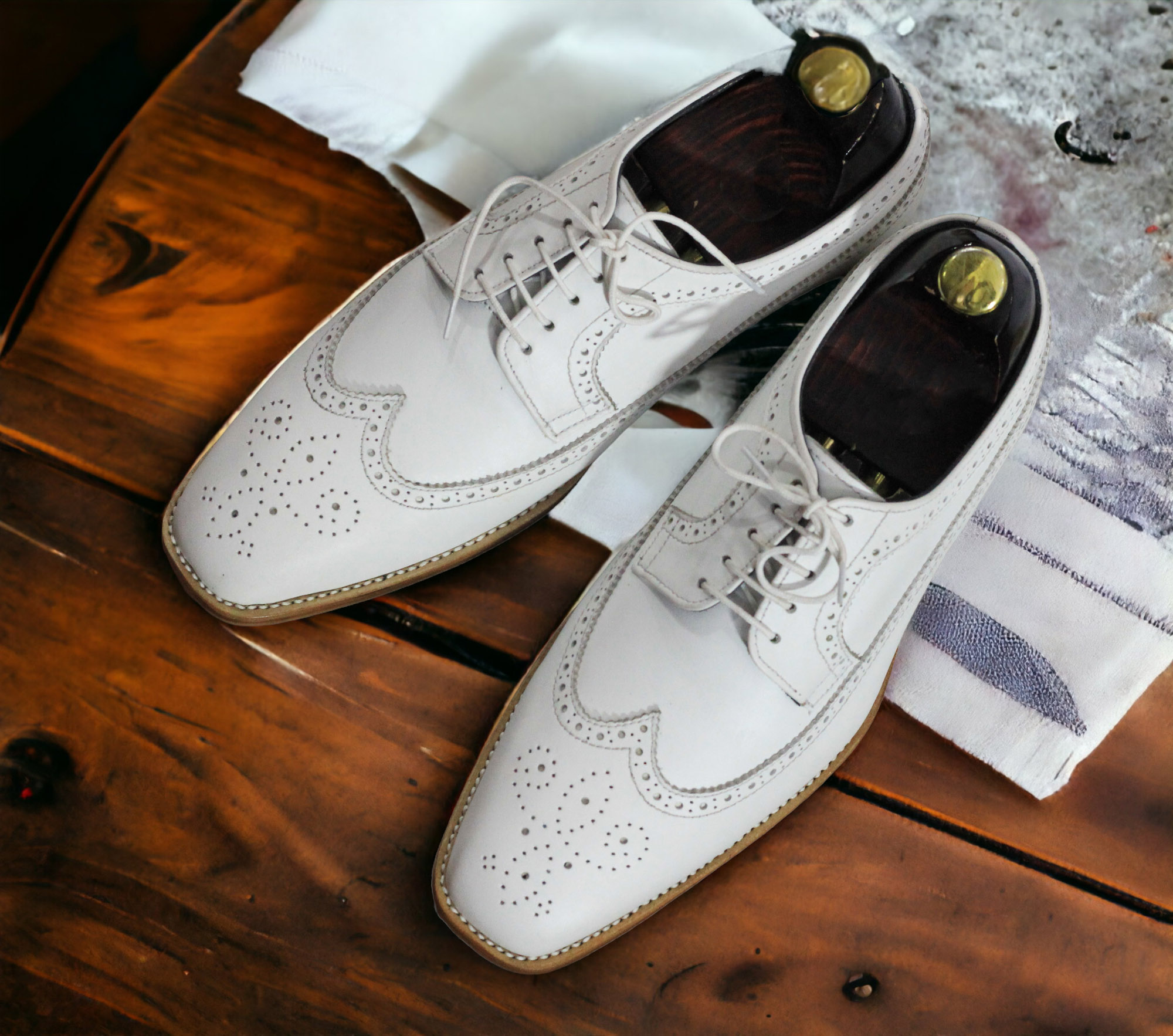 Handmade White Wing Tip Lace Up Leather Shoes, Dress Business Shoes