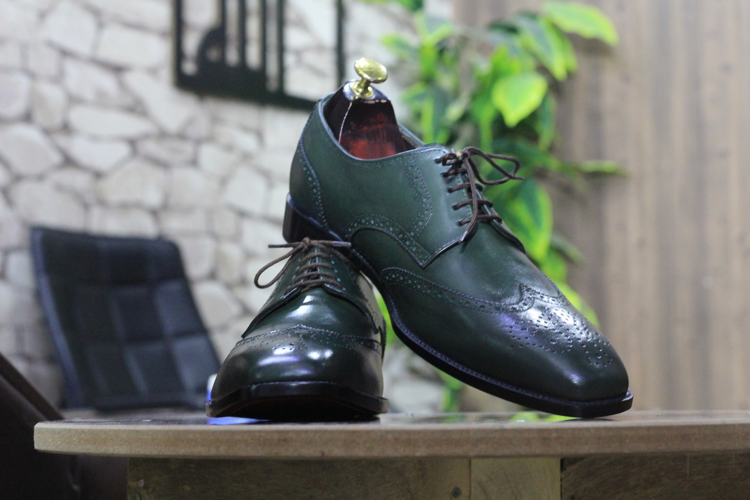 Handmade Green Leather Shoes, Men's New Stylish Wing Tip Shoes, Brogue Toe Shoes