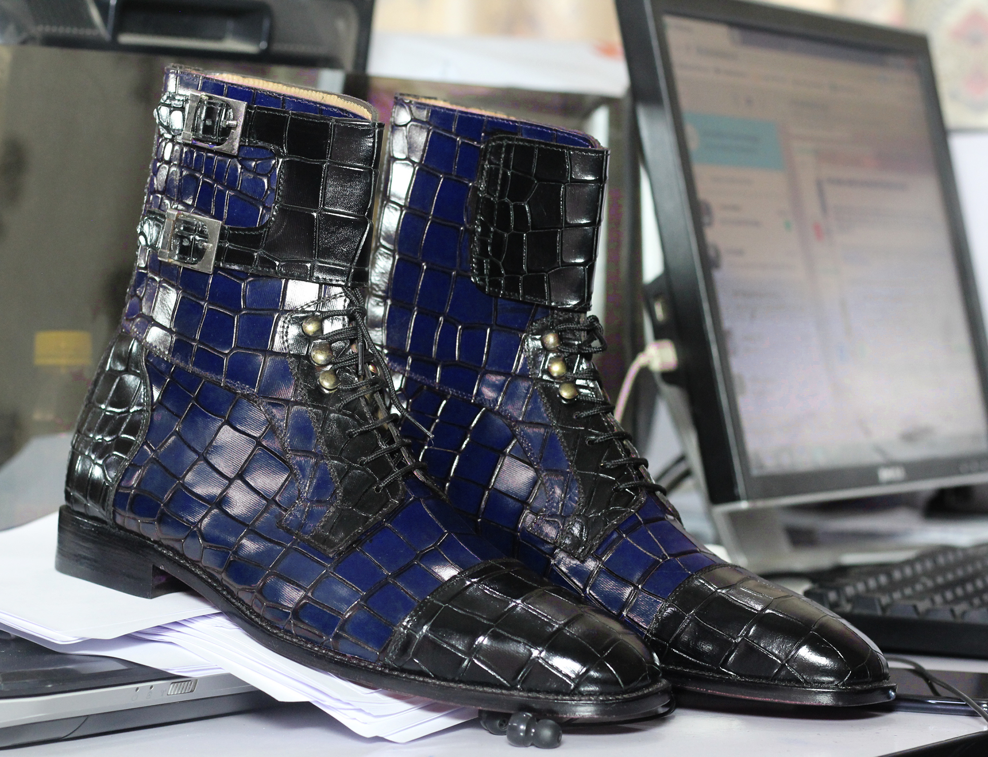 Black & Blue Double Monk Ankle High Alligator Texture Boot, Designer Boots For Men's
