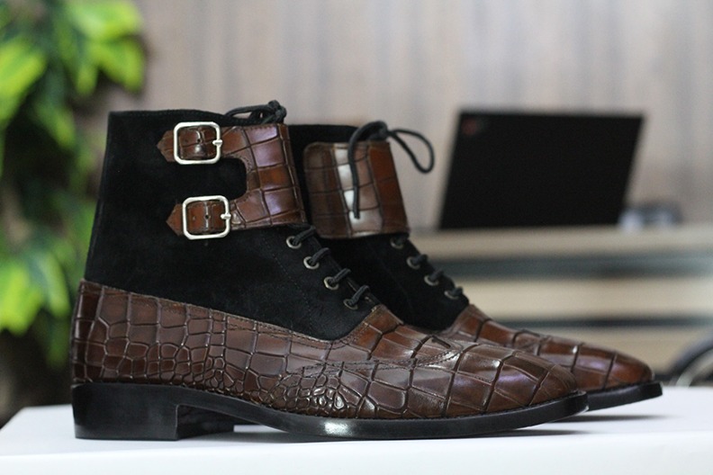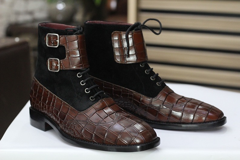 Ankle High Men's Alligator & Suede Boot, Double Buckle Boot, Wing Tip Designer Boot