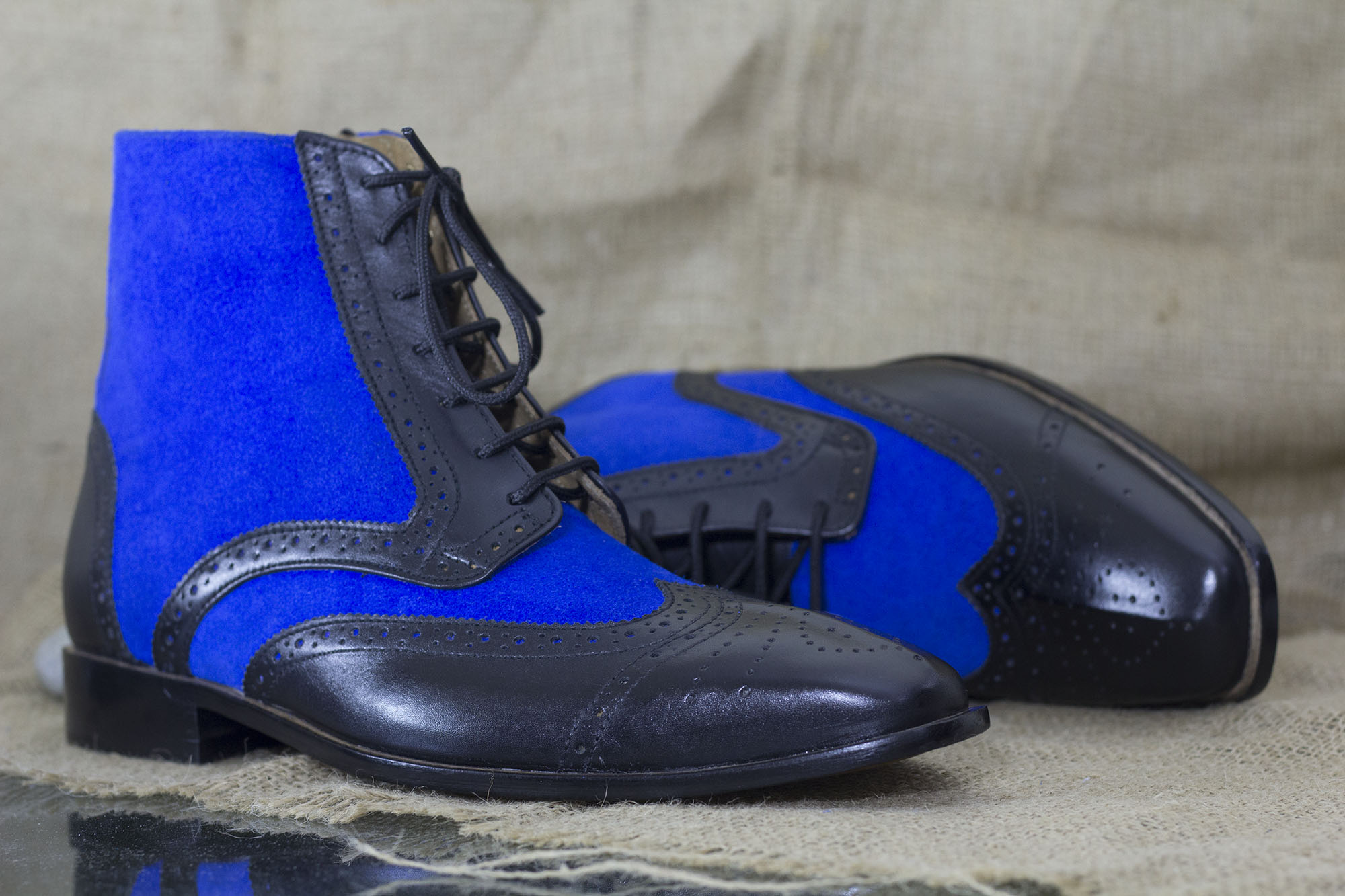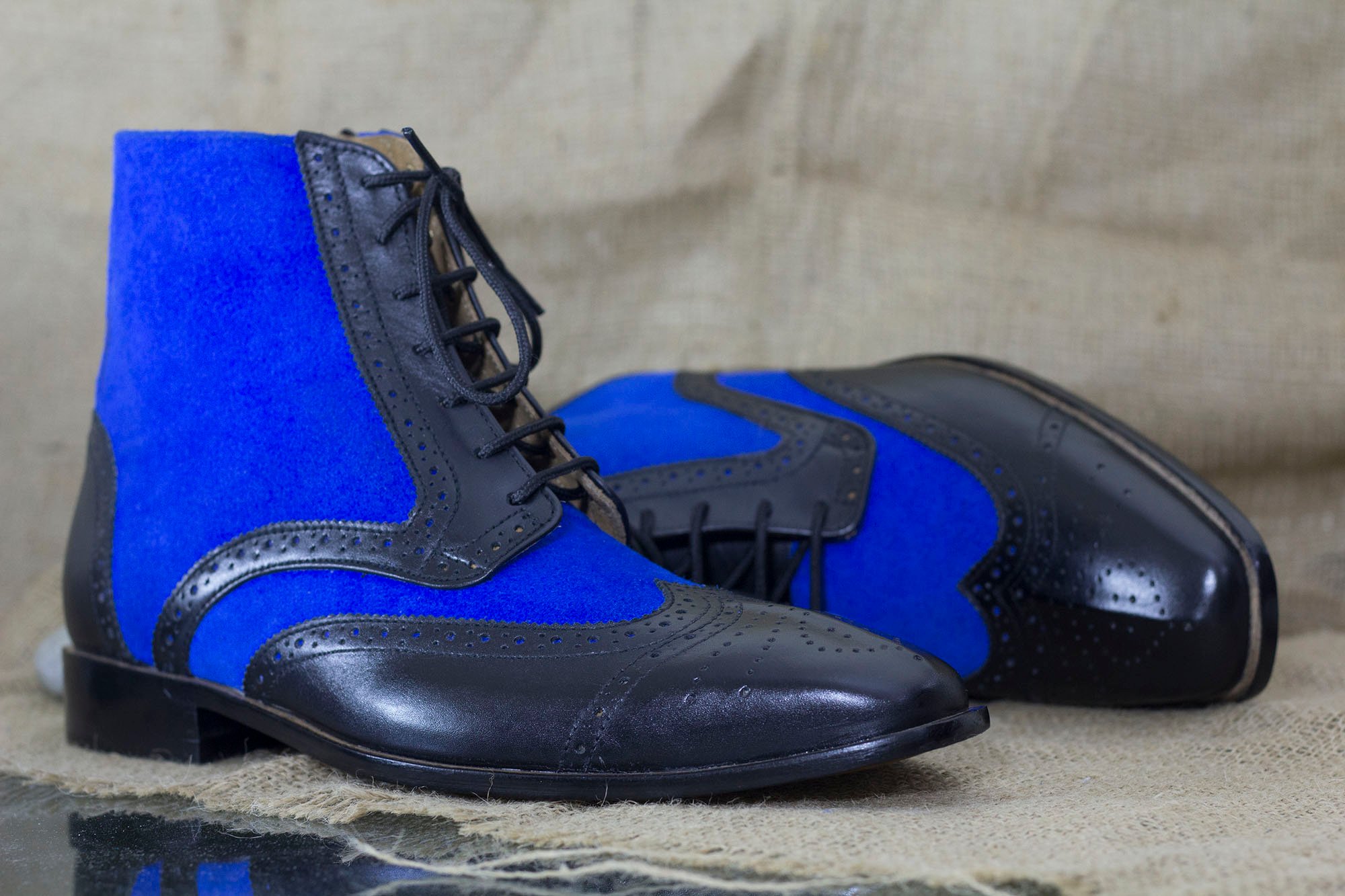 Black Blue Leather Suede Ankle High Lace Boot, Fashion Boots For Men's