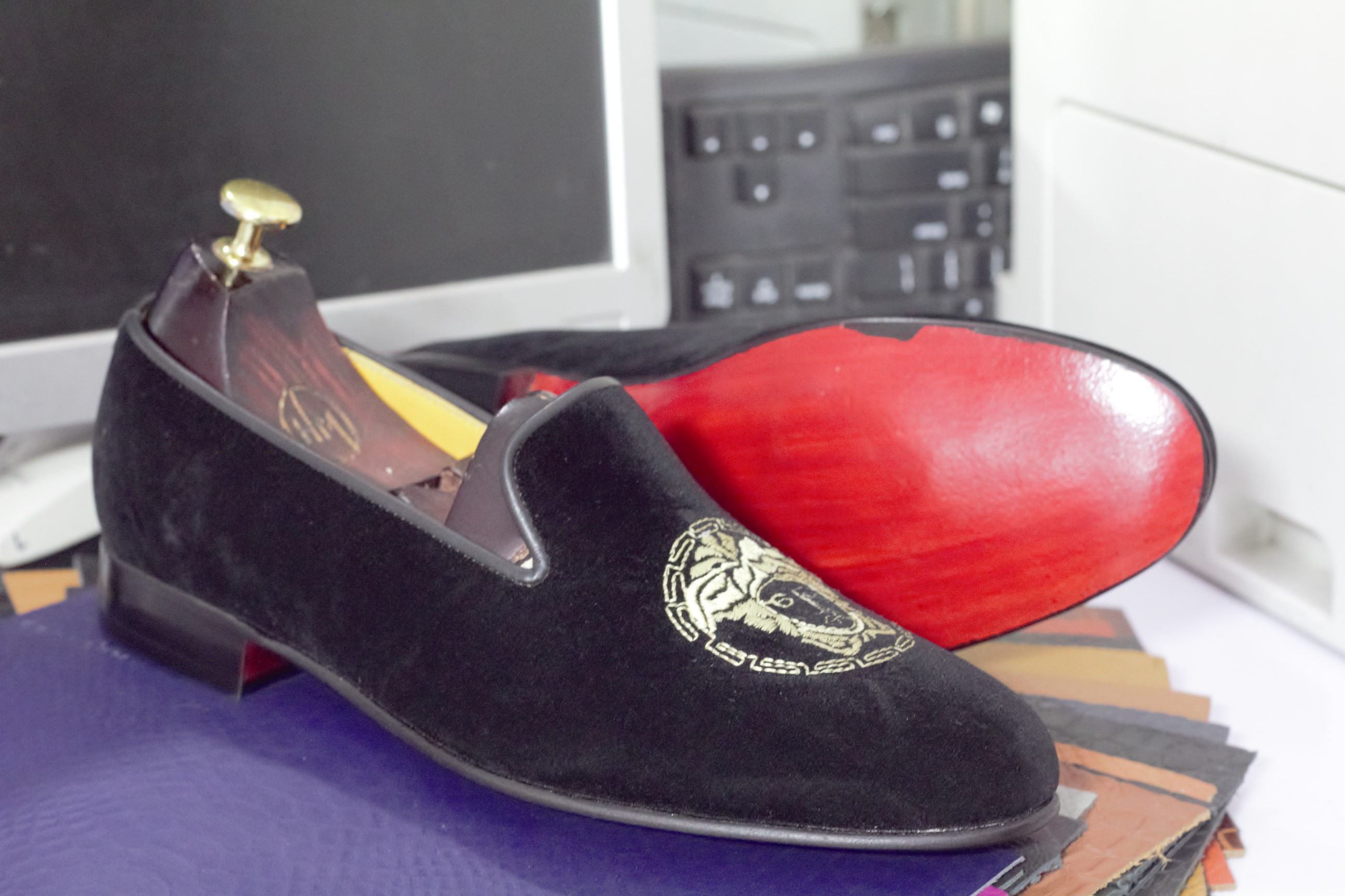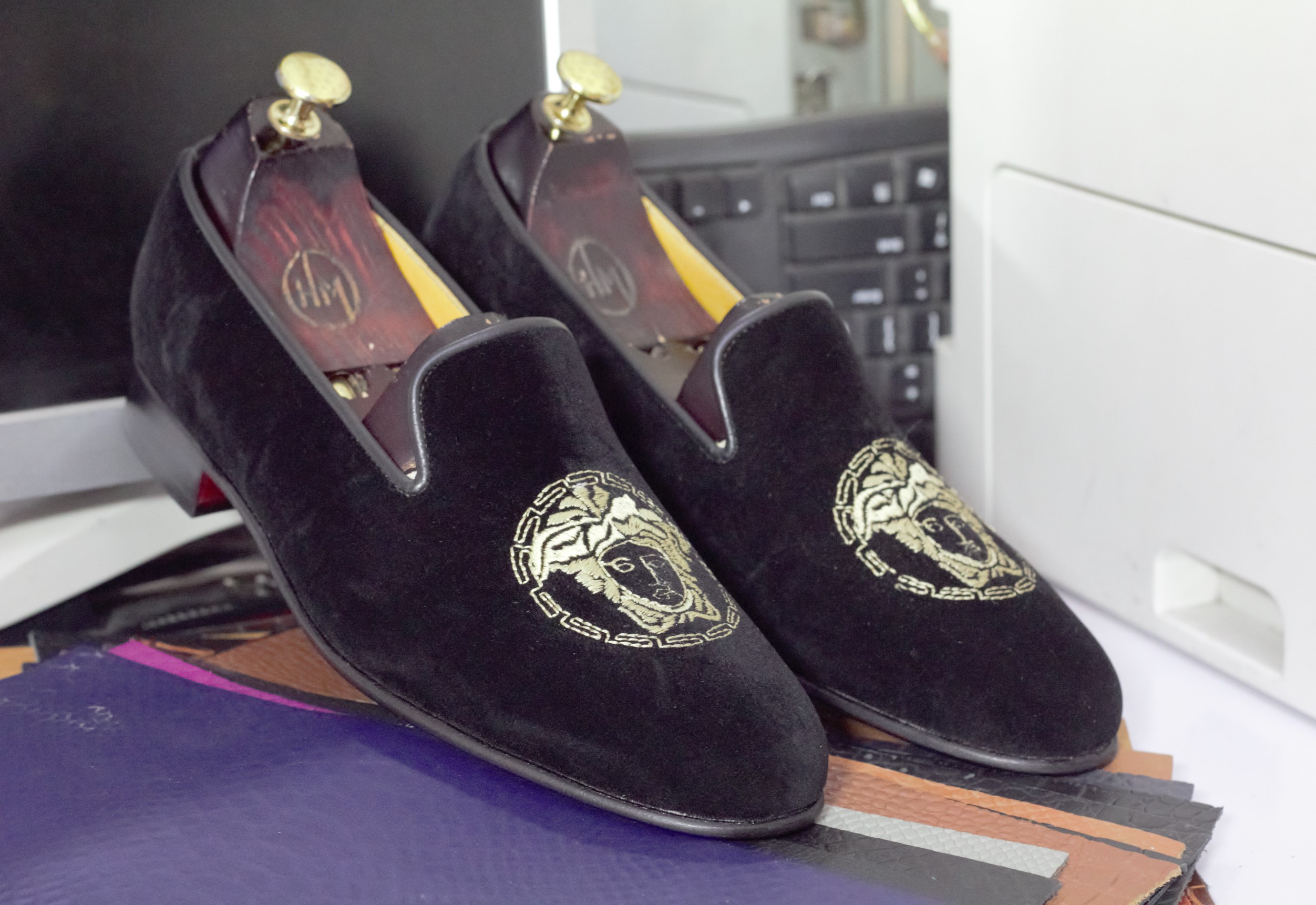 Men's Stylish Embroidery Patches Pure Black Velvet Handmade Shoes