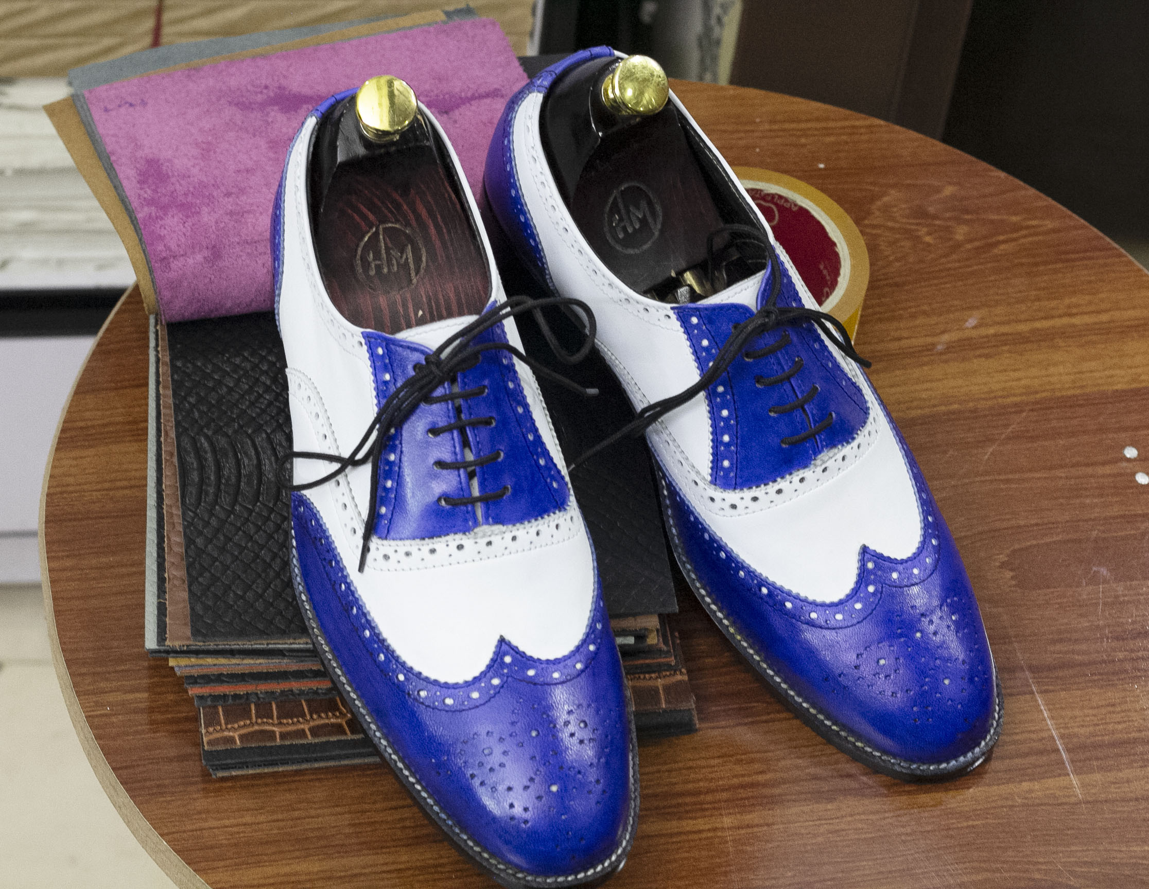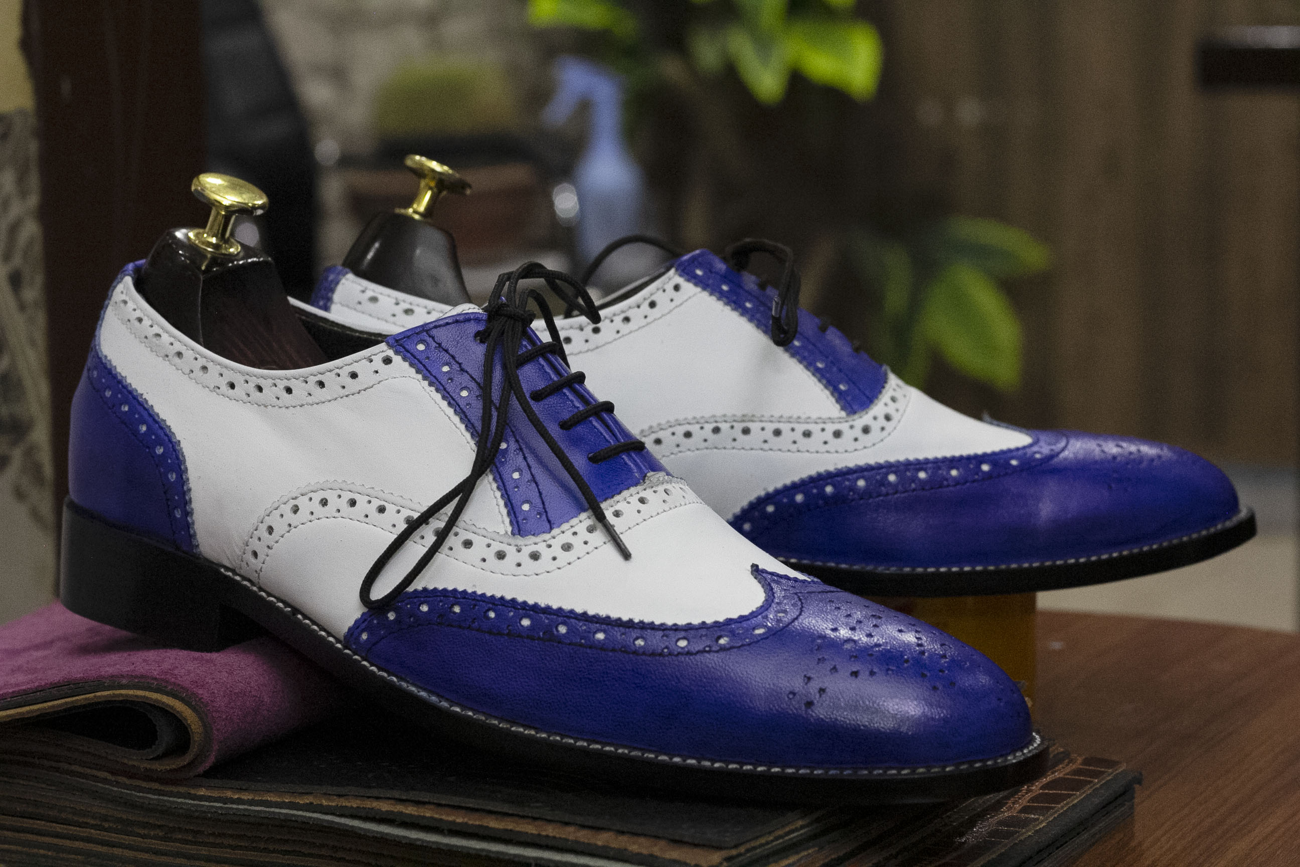 Handmade Men's Blue & White Wing Tip Style Pure Leather Shoes