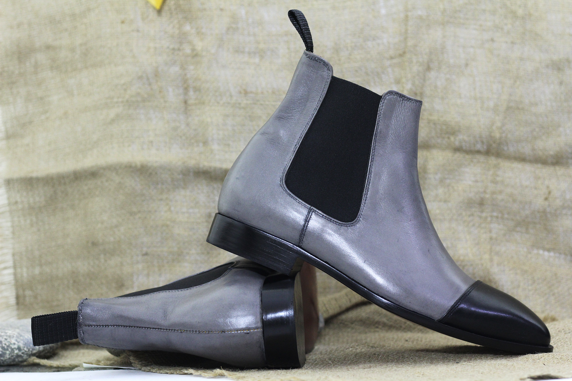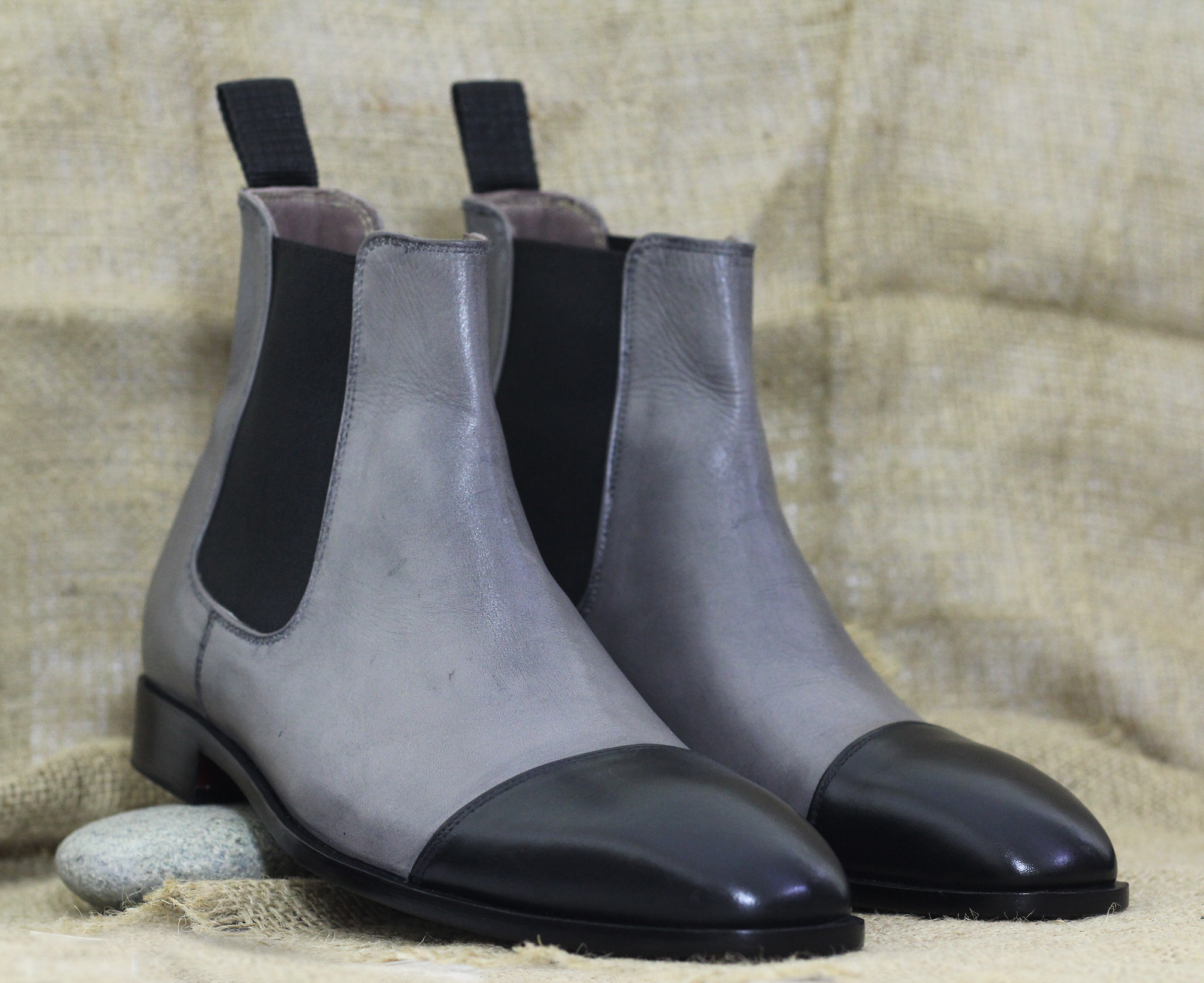 Black Gray Chelsea Leather Boot For Men's Cap Toe Handmade Boot