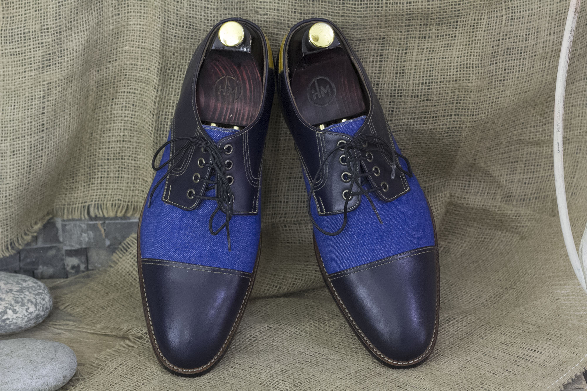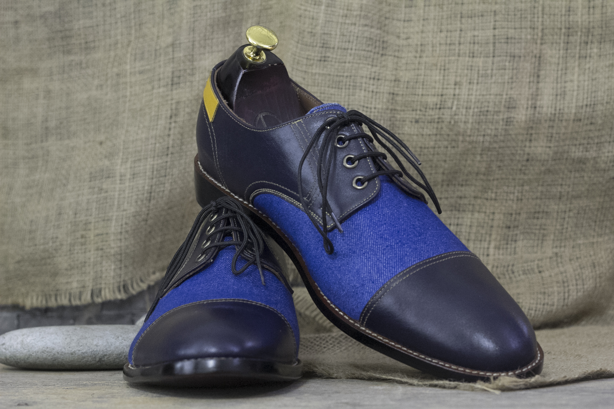 Men's New Stylish Blue Pure Leather & Denim Leather Lace Up Shoes
