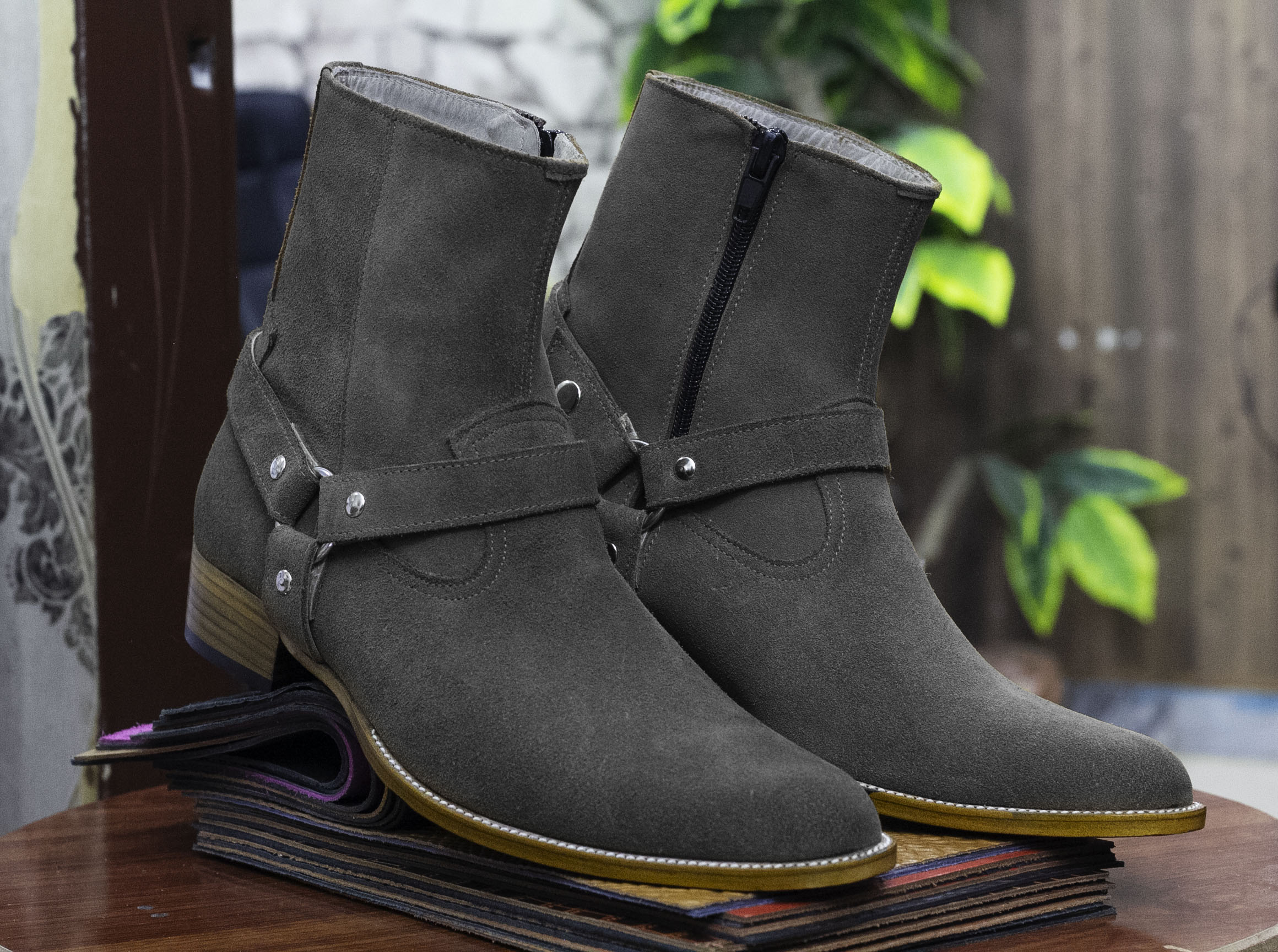 Ankle High Side Zipper Boot, Gray Suede Madrid Strap Boots For Men's