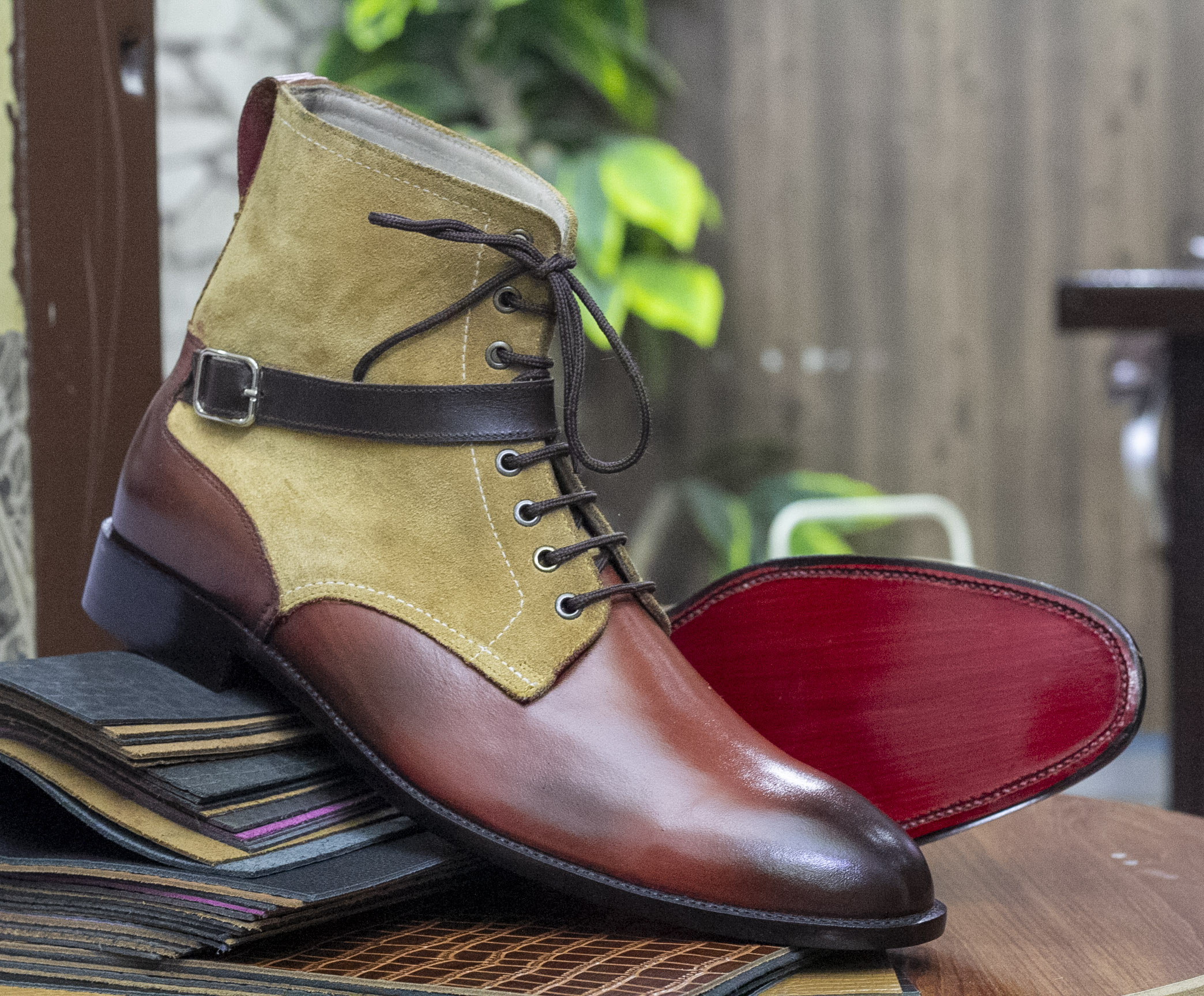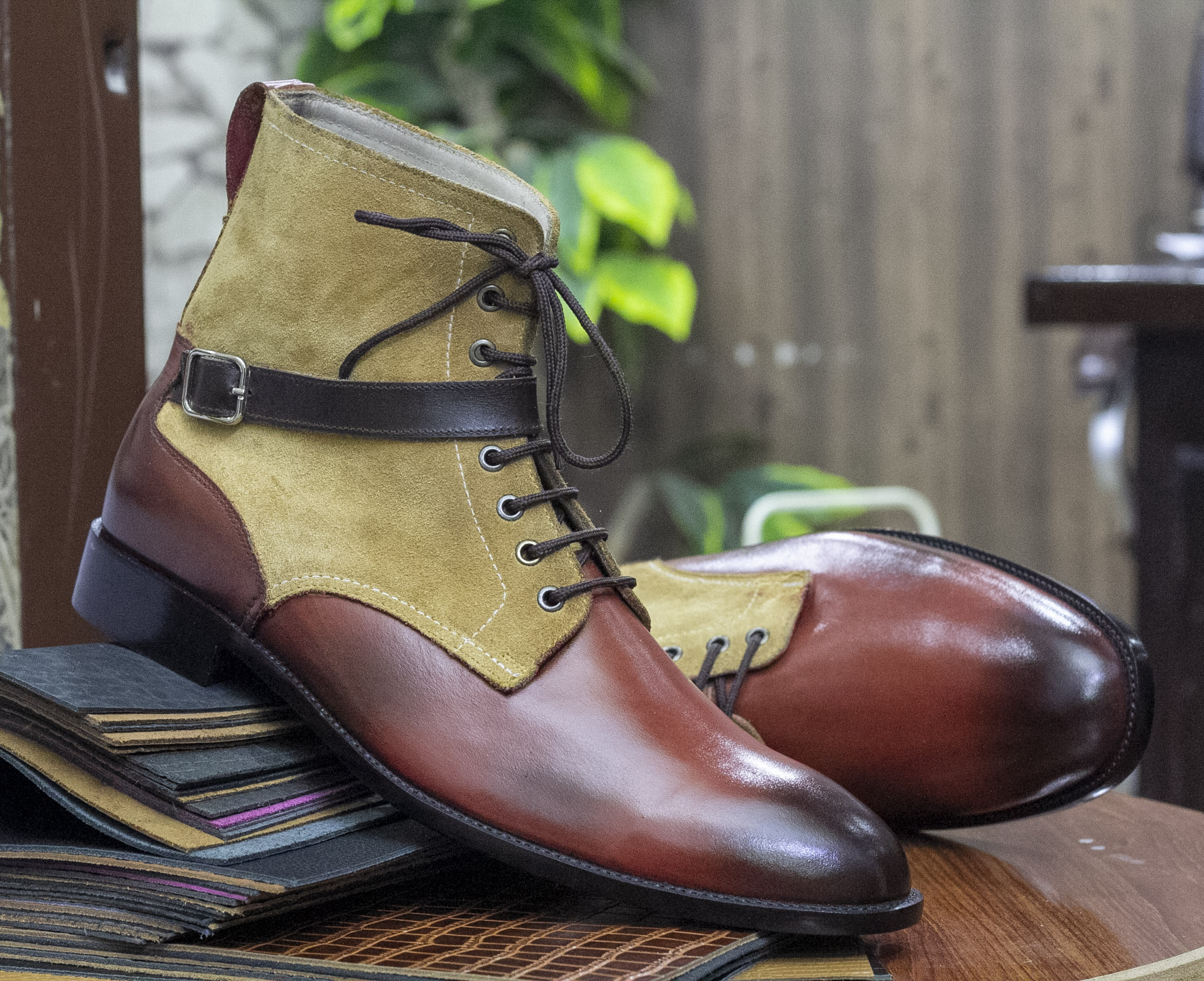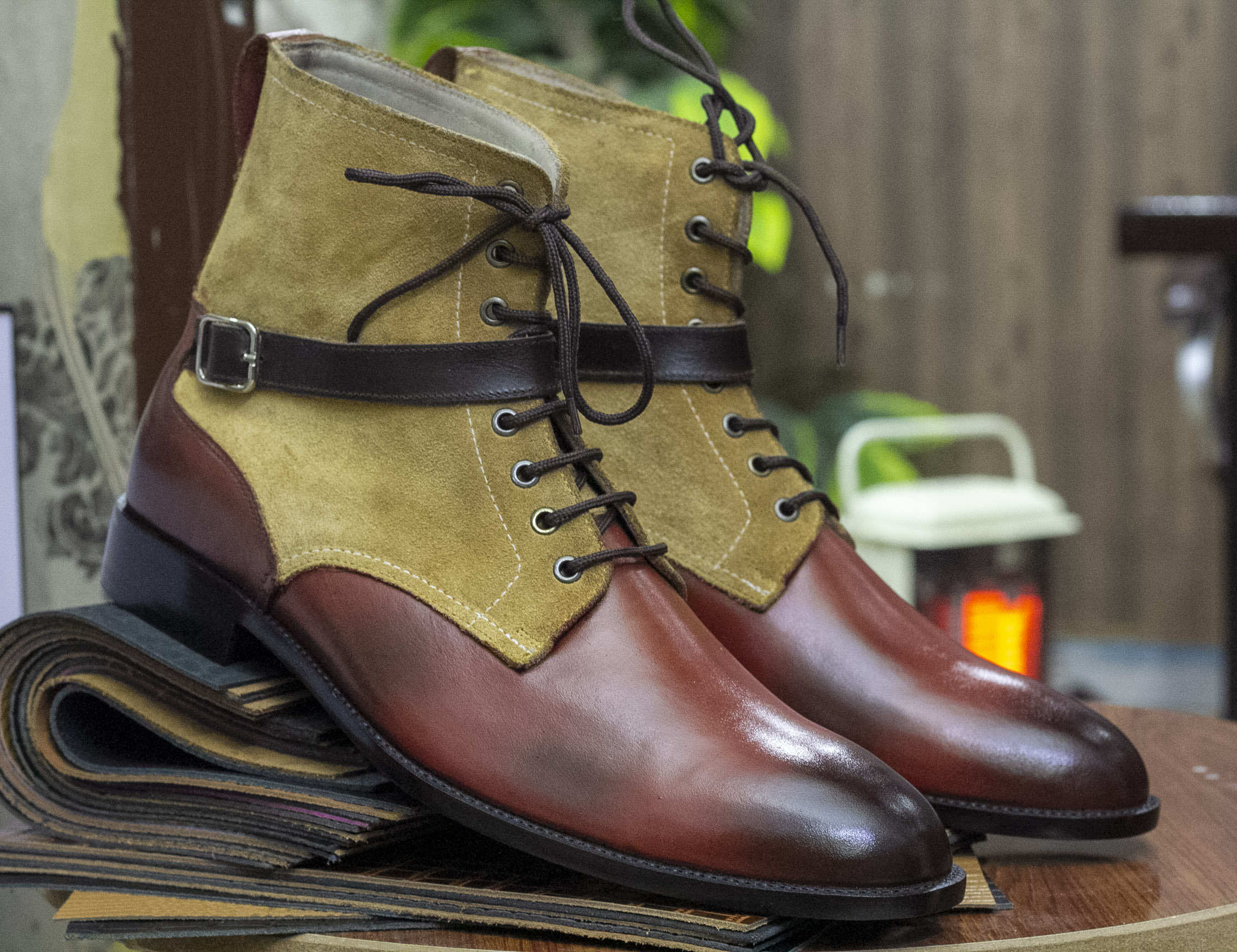 Two Tone Buckle Lace Up Boot, Handmade Leather Suede