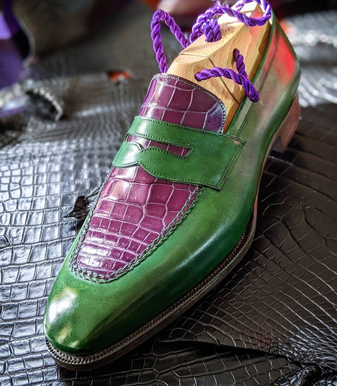New Designer Alligator Texture & Leather Shoes Penny Loafer Shoes For Men's Hand Painted