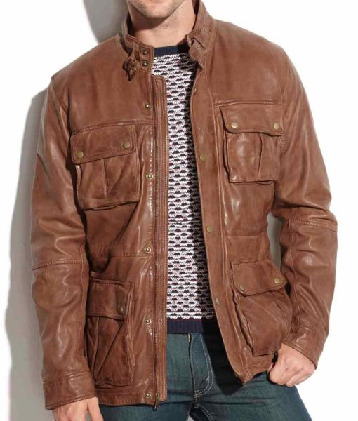 Men Brown Leather Jacket With Multiple Cargo Pockets, Men Winter Fashion Jacket