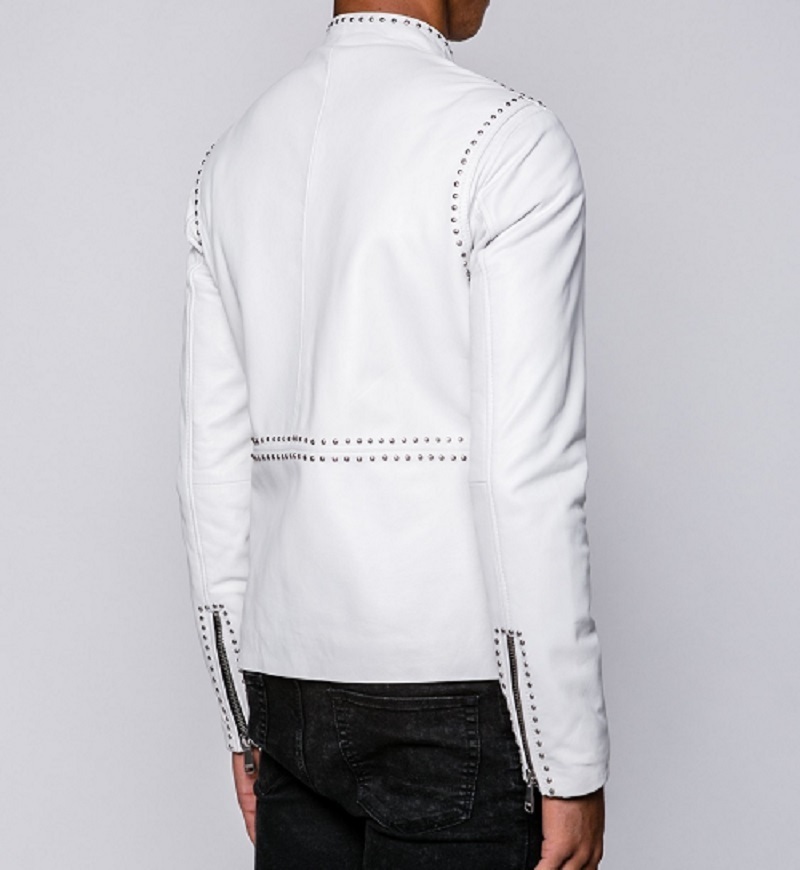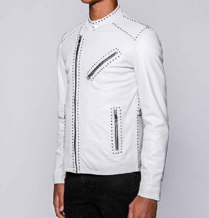 Men Slim fit studded White leather Jacket, Men Rock motorcycle Jacket