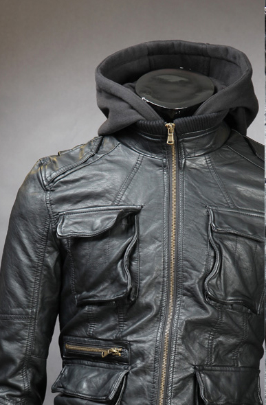 Men Detachable Handmade Fabric Hooded Leather Jacket