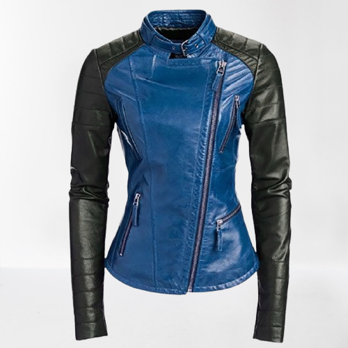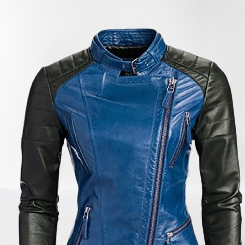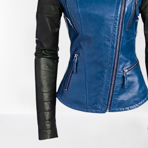 Women Blue and Black Leather Slim fit Jacket, Biker Fashion Jacket
