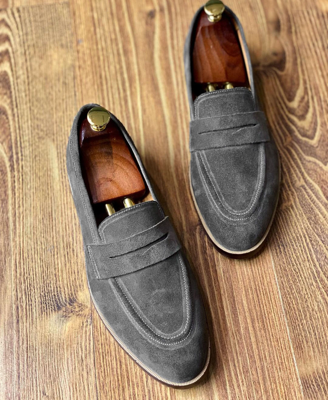 Handmade Gray Suede Penny Loafer Slip On Men's Shoes