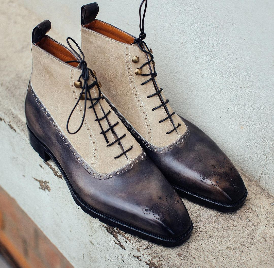 Handmade Ankle High Two Tone Leather Suede Brogue Toe Lace Up Boot