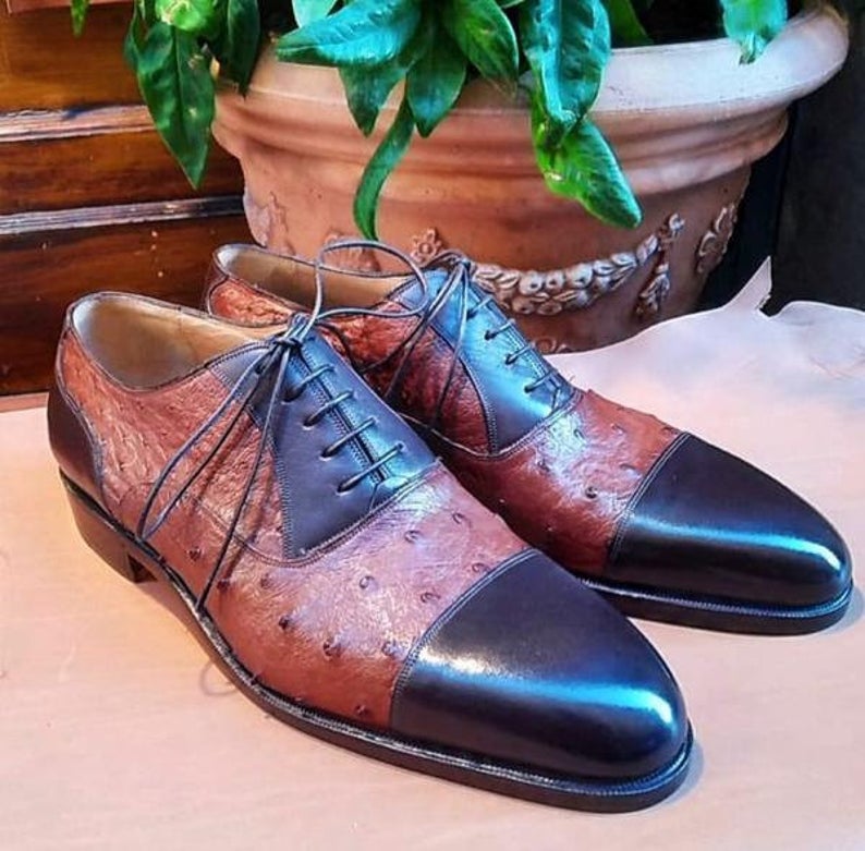 New Pure Handmade Brown Ostrich & Black Leather Lace Up Stylish Shoes For Men's