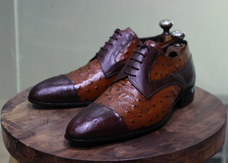 Men's Handmade Tan Ostrich Burgundy Alligator & Plain Leather Party Shoes For Men's