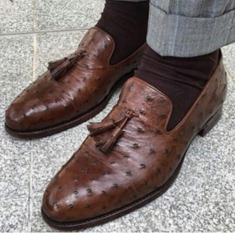 New Handmade Pure Brown Ostrich Leather Stylish Tussle Loafer Shoes For Men's