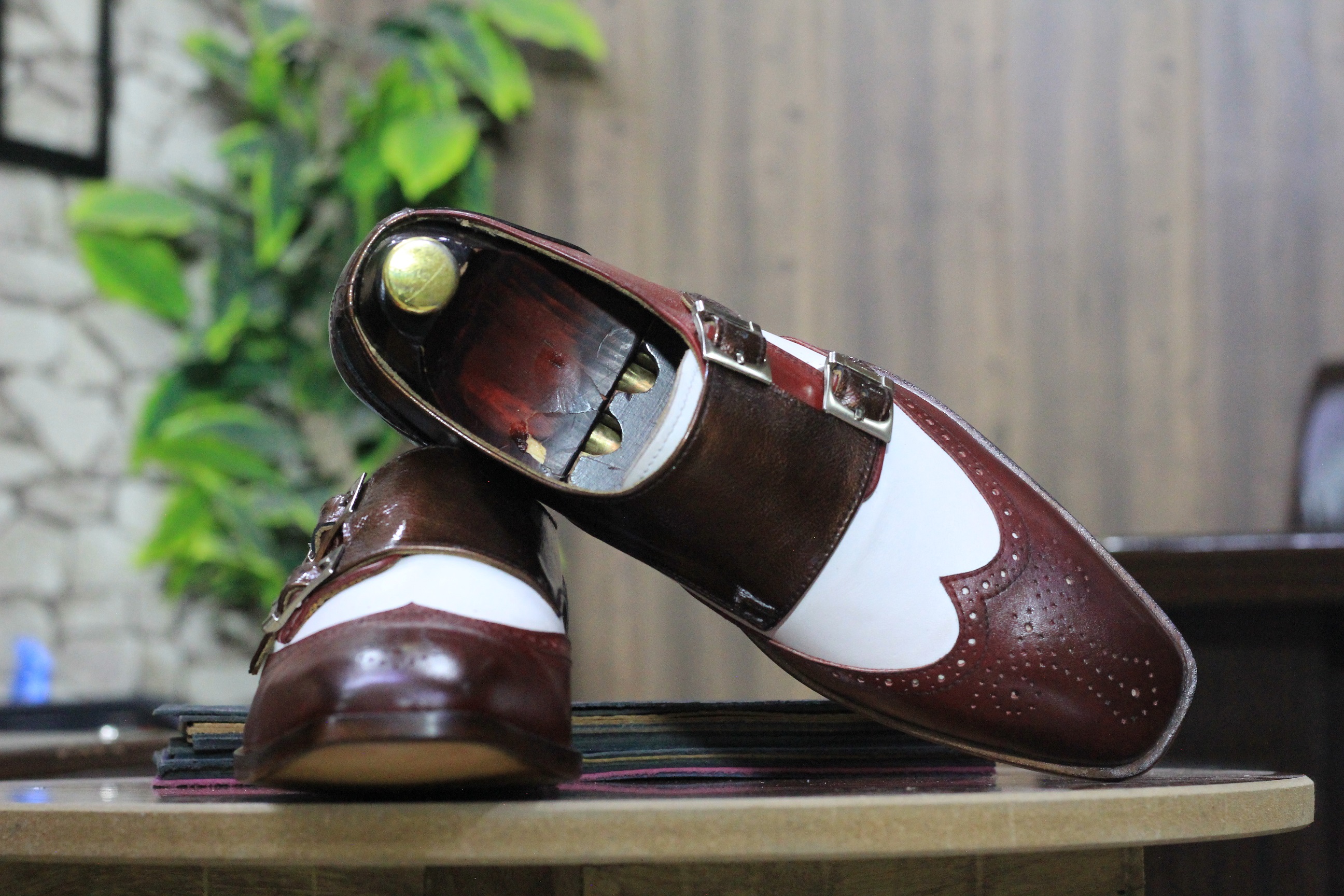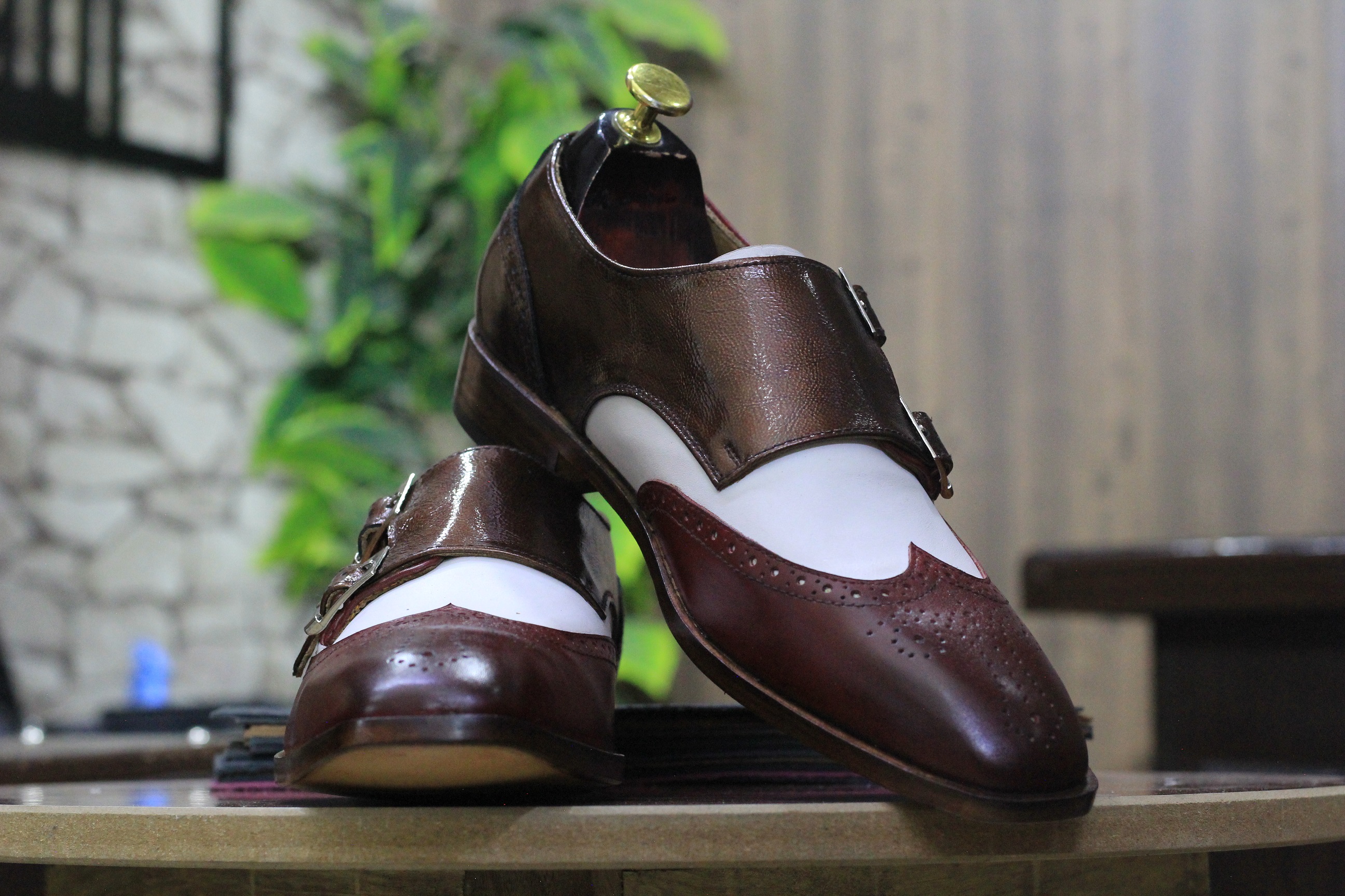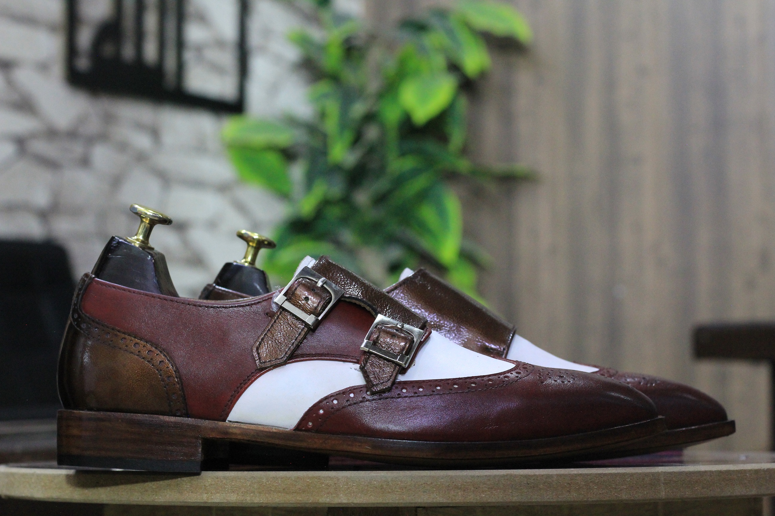 Handmade Two Tone Genuine Leather Double Monk, Wing Tip Shoes For Men's