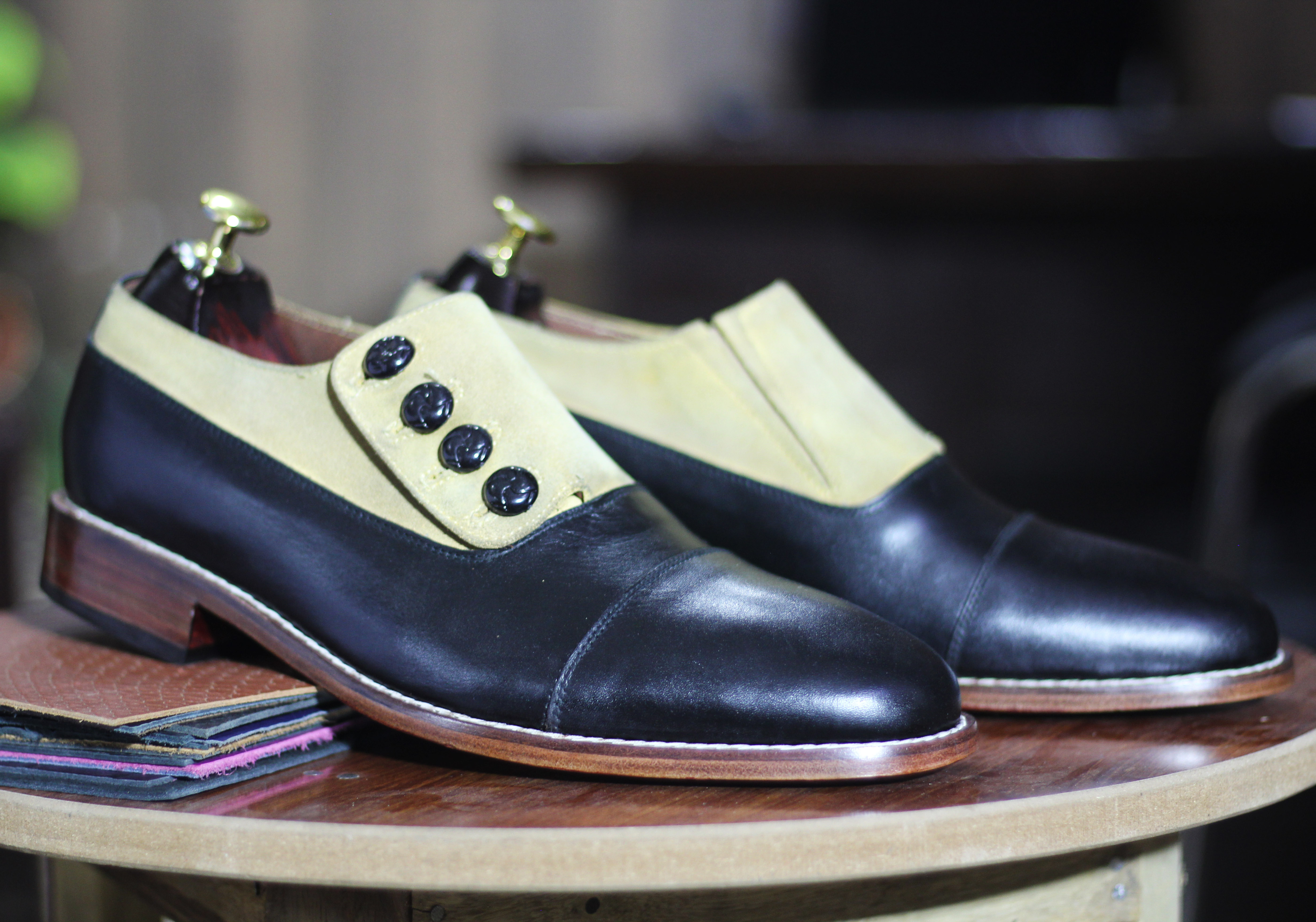 Men's Two Tone Button Style Leather Suede Shoes Handmade Cap Toe Style Shoes