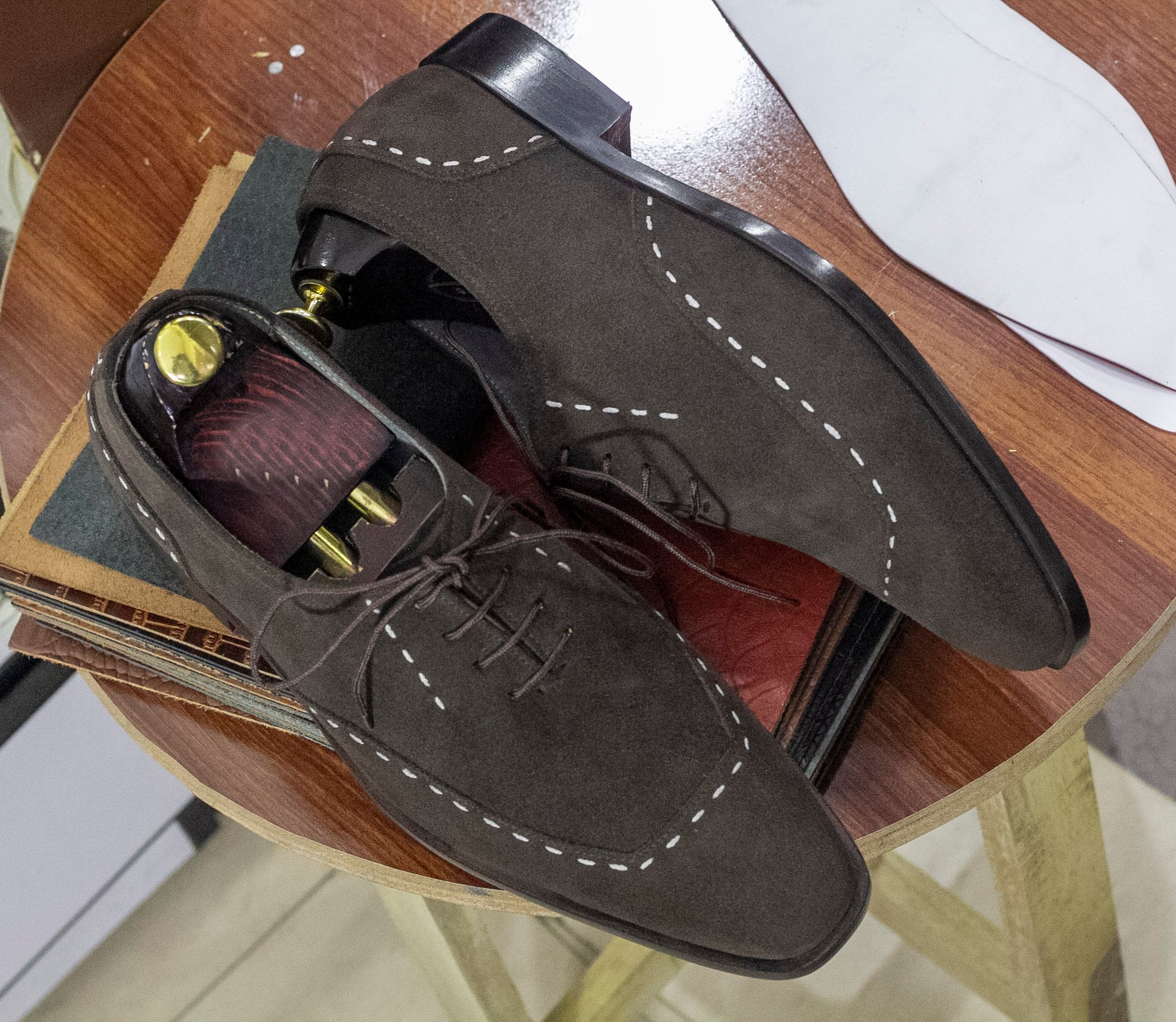 Handmade Men's Casual Whole Cut Suede Lace Up Shoes Square Toe Shoes With White Stitching Shoes