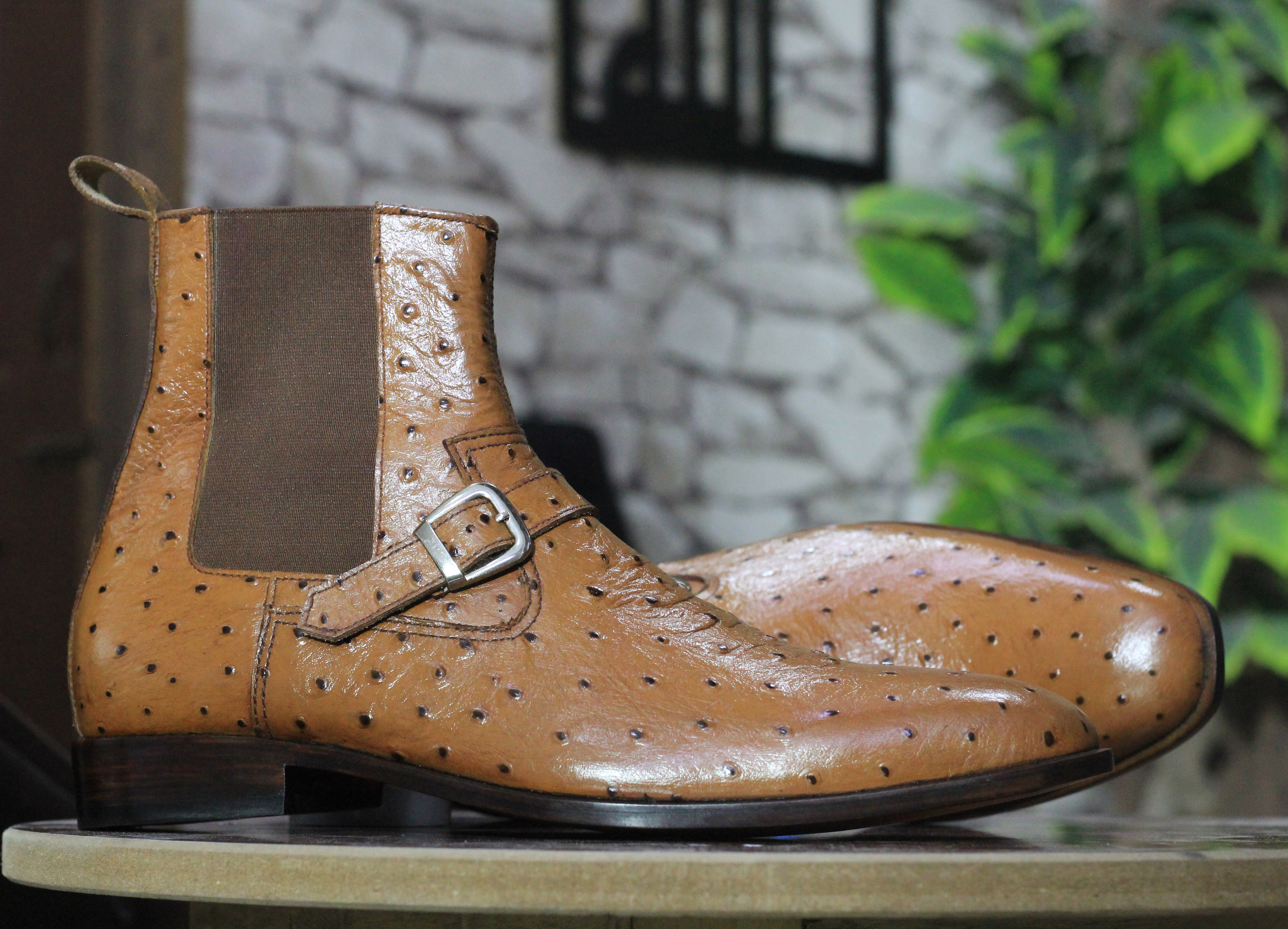 Ankle Tan Ostrich Leather Boot, Chelsea With Buckle Style, Handmade Boots For Men's