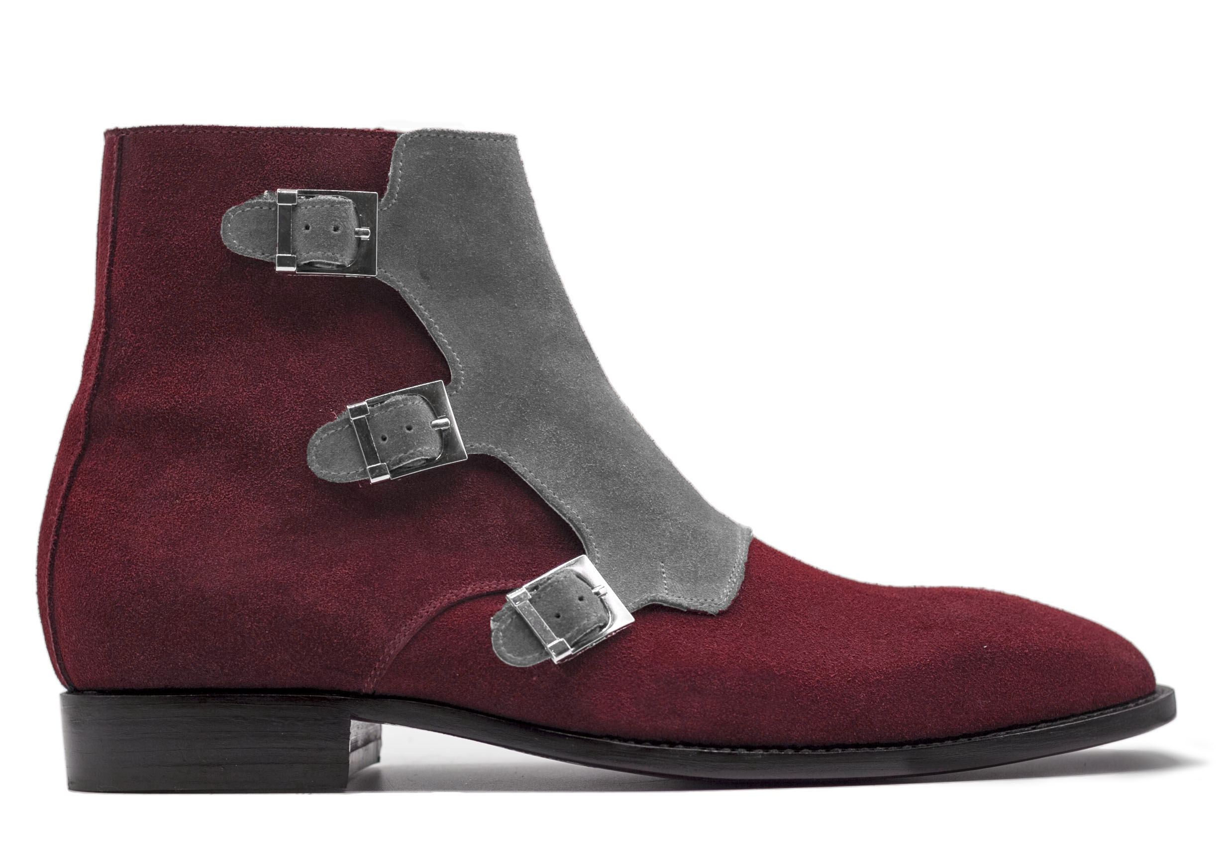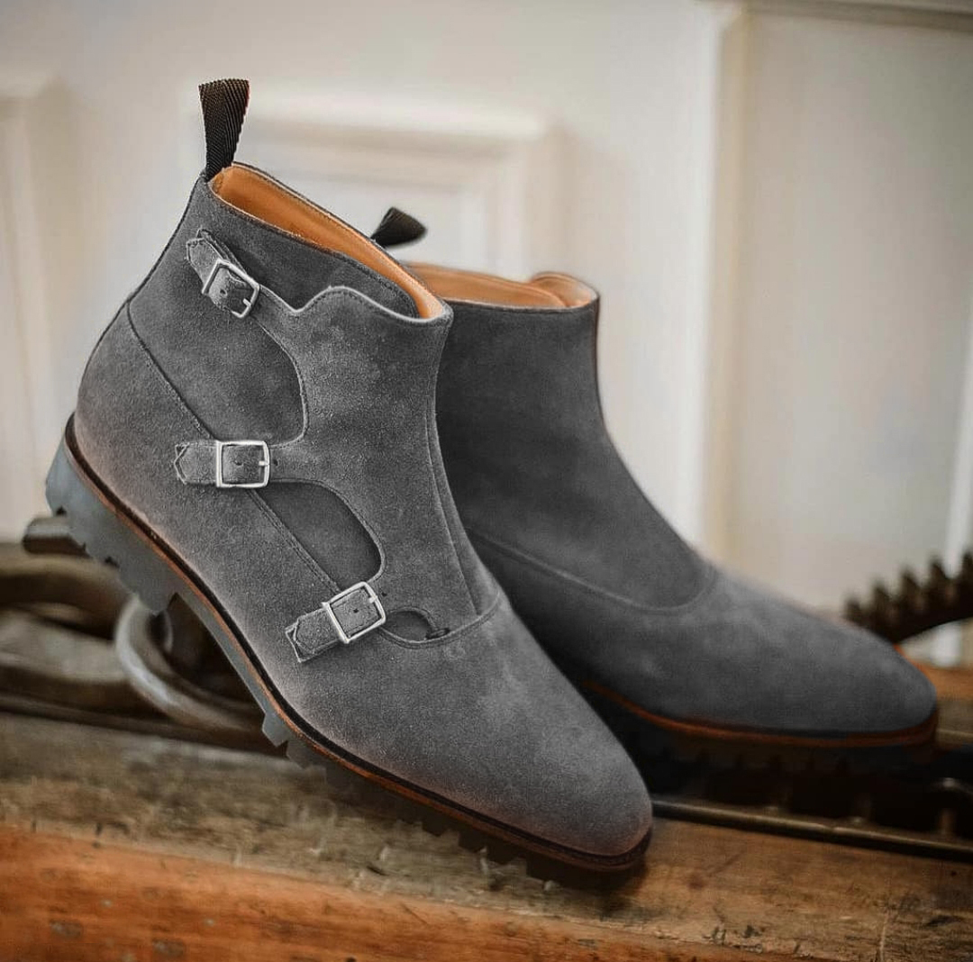 Ankle High Handmade Men's Gray Suede Triple Monk Strap Boot