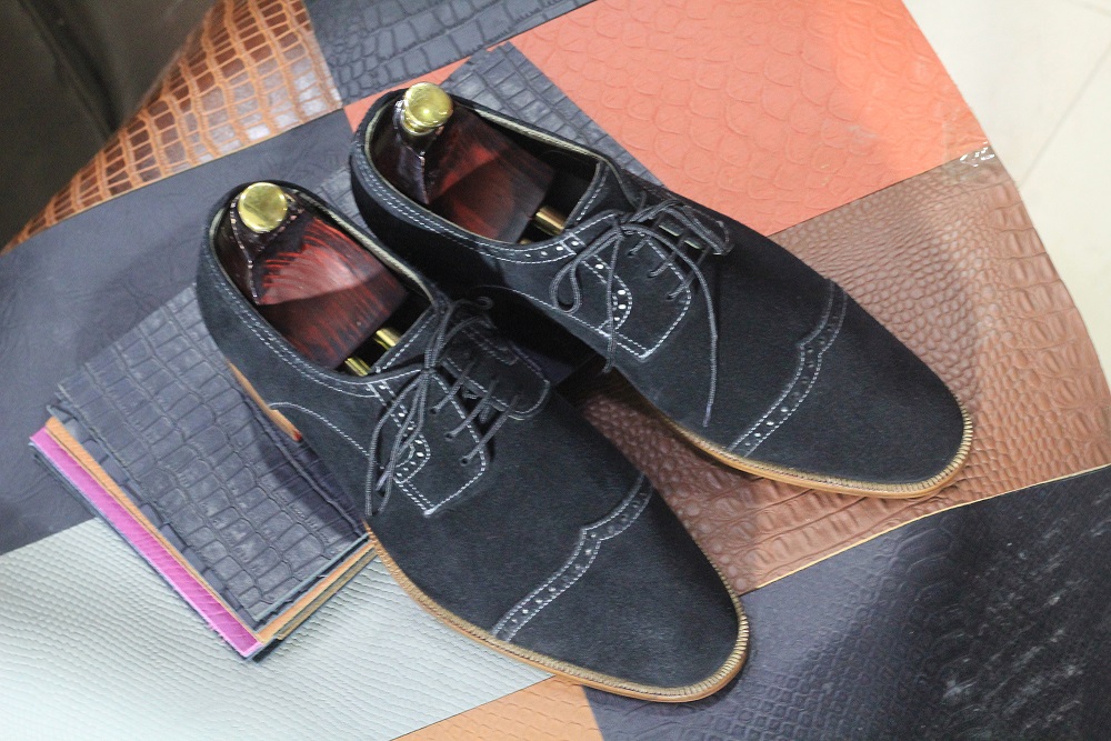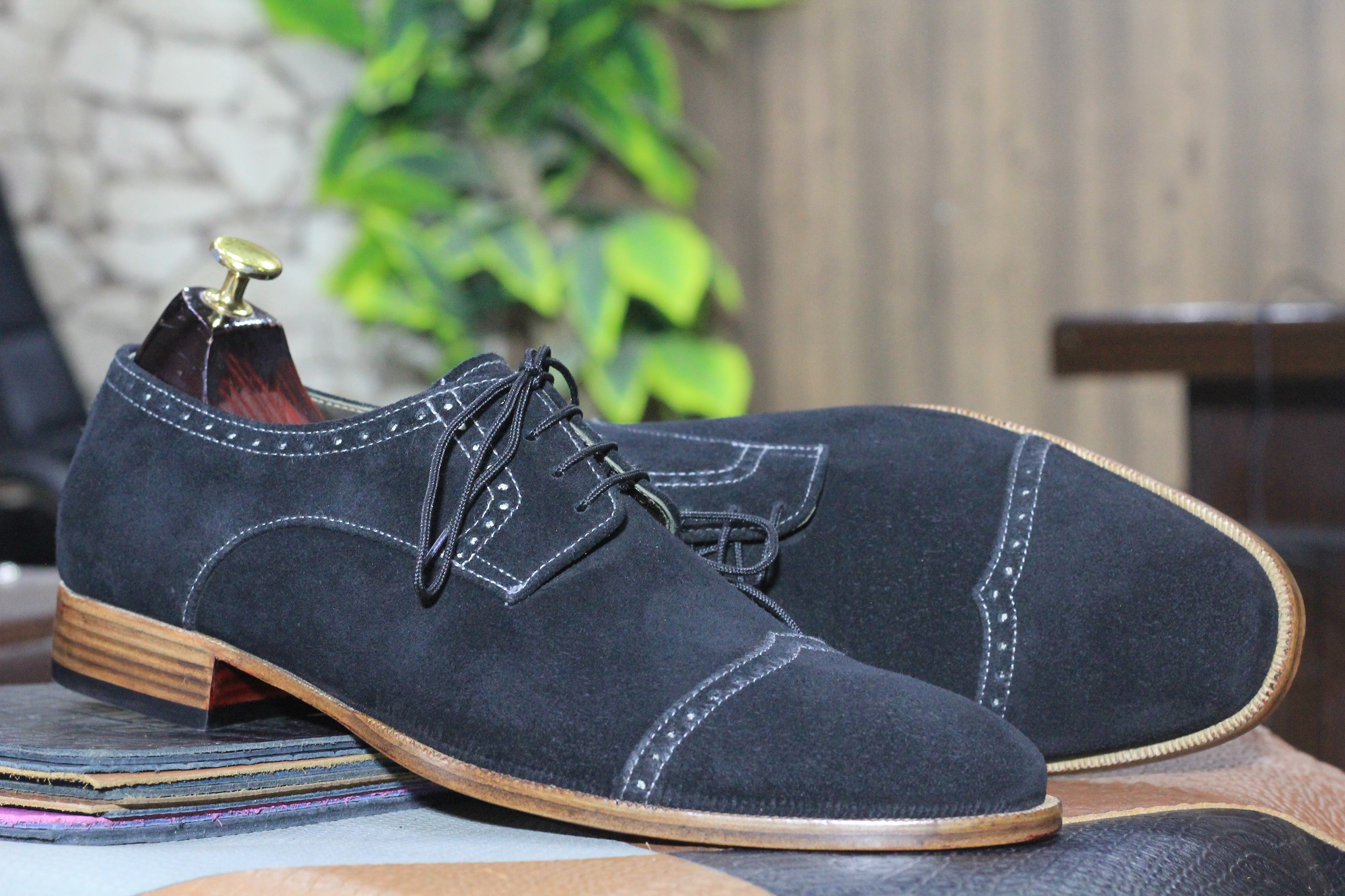Hand Stitched Black Suede Coated Wing Tip Lace Up Men's Dress Leather Shoes