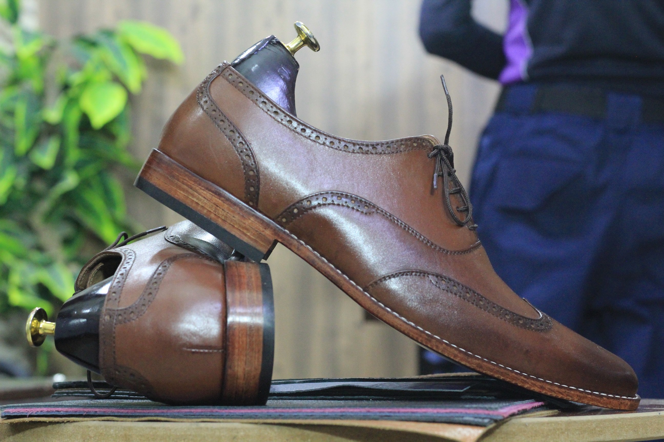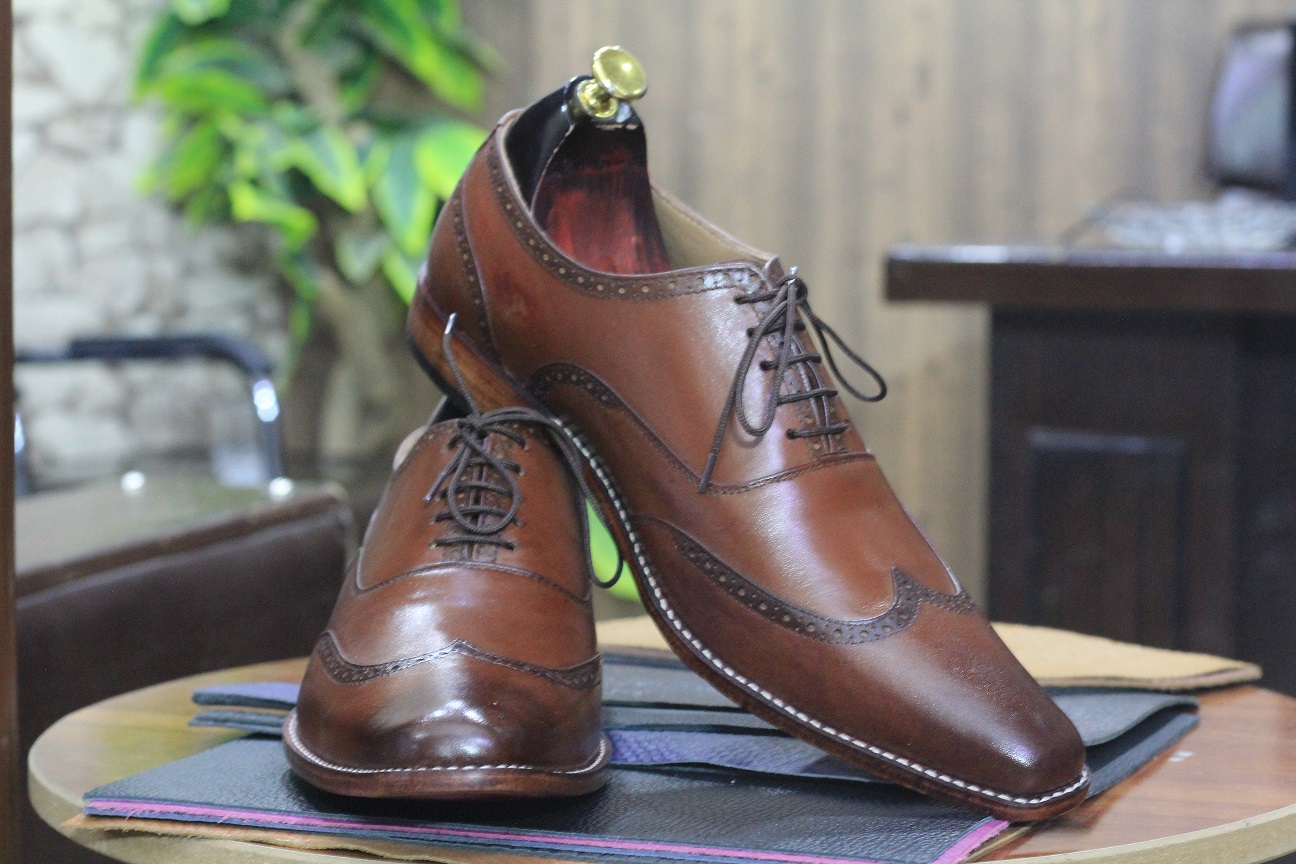 Handmade Brown Brogue Leather Lace Up Wing Tip Shoes For Men
