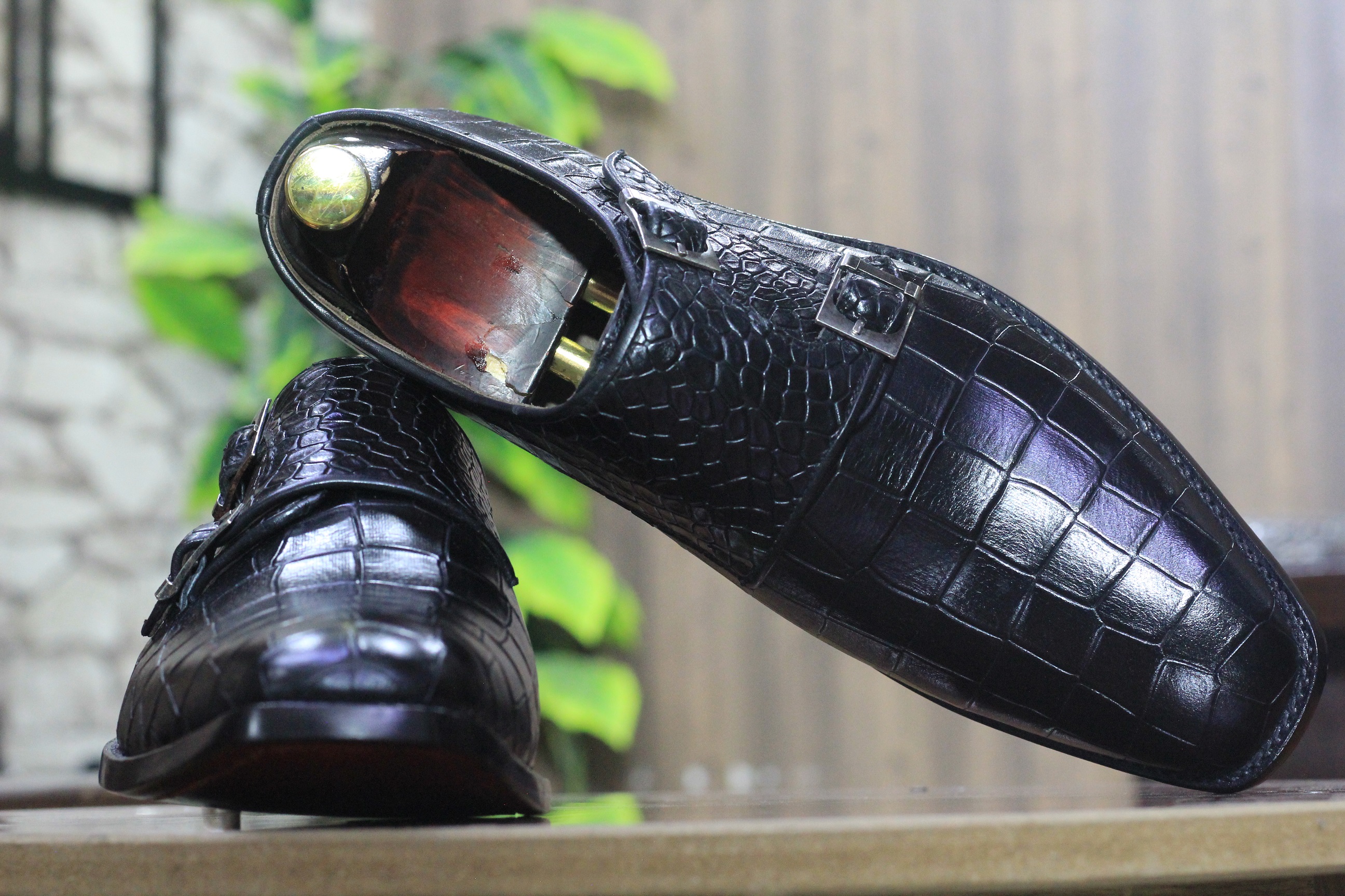 Handmade Men's Black Alligator Skin Texture Double Monk Dress Leather Shoes