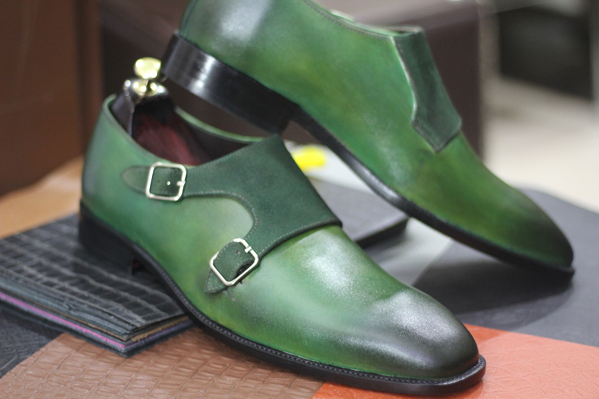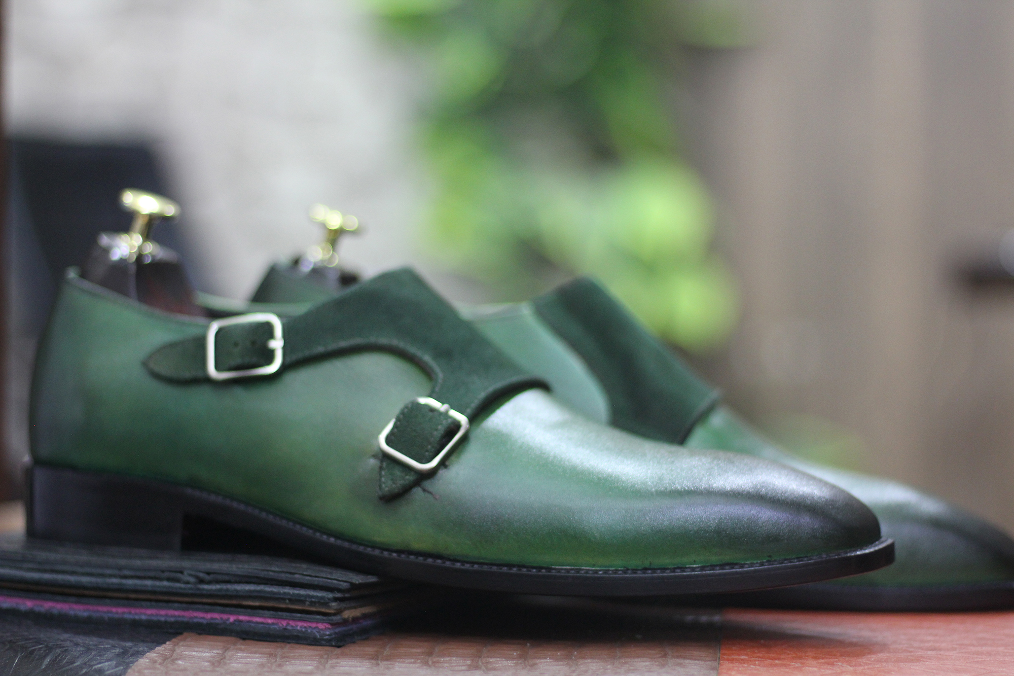 Men's Green Leather & Suede Double Monk Handmade Dress Shoes