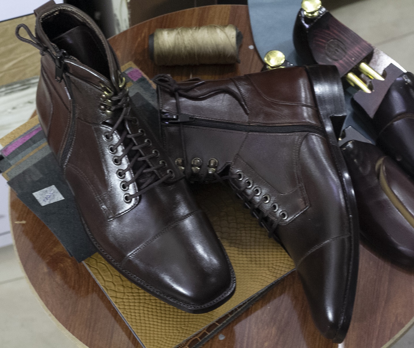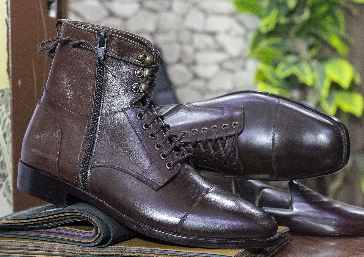 Hand Painted Brown Ankle High Side Zipper Cap Toe Lace UP Leather Boot For Men