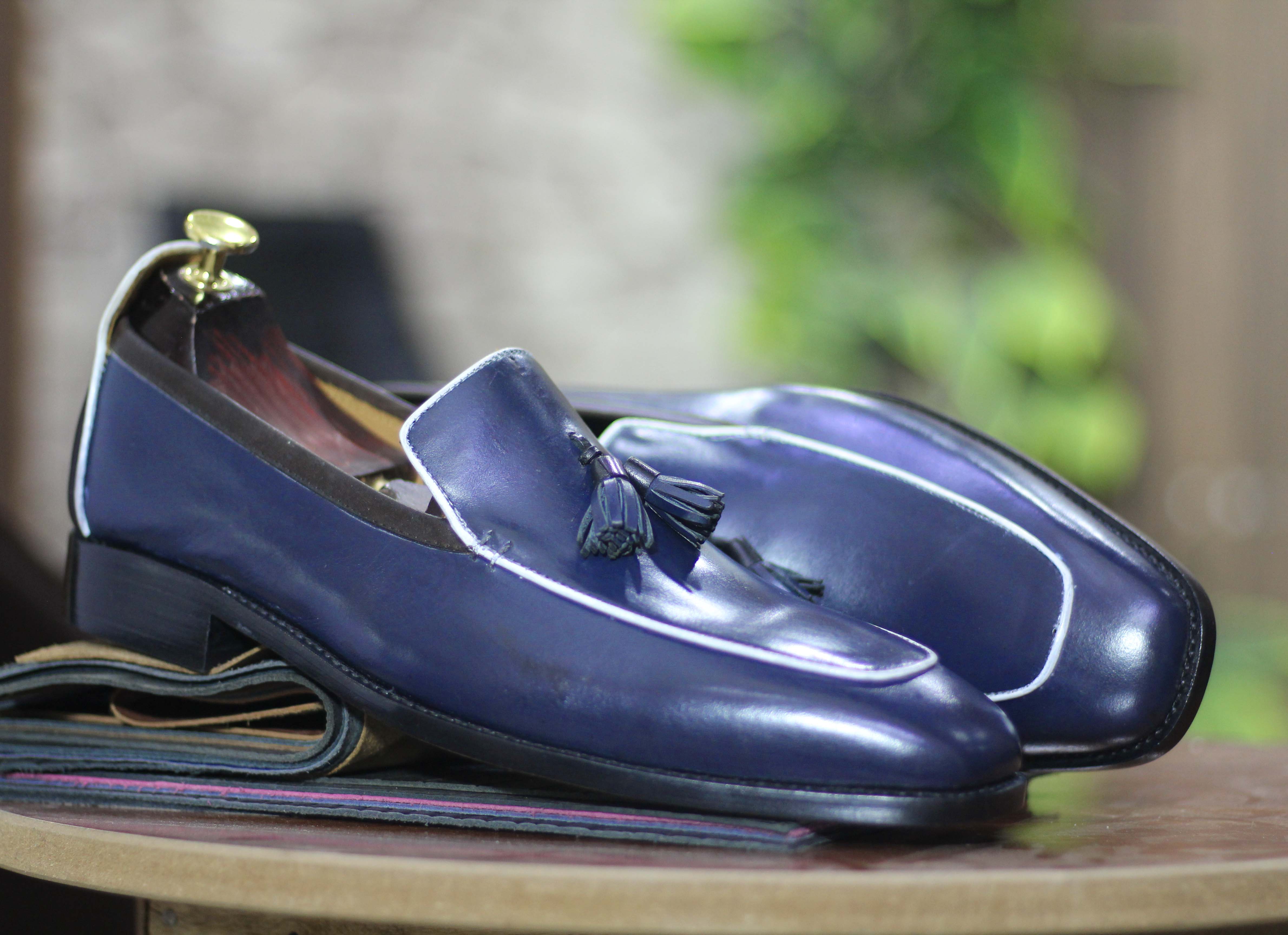 Handmade Blue Tasselled Leather Loafers For Men's Classic Foot Wear