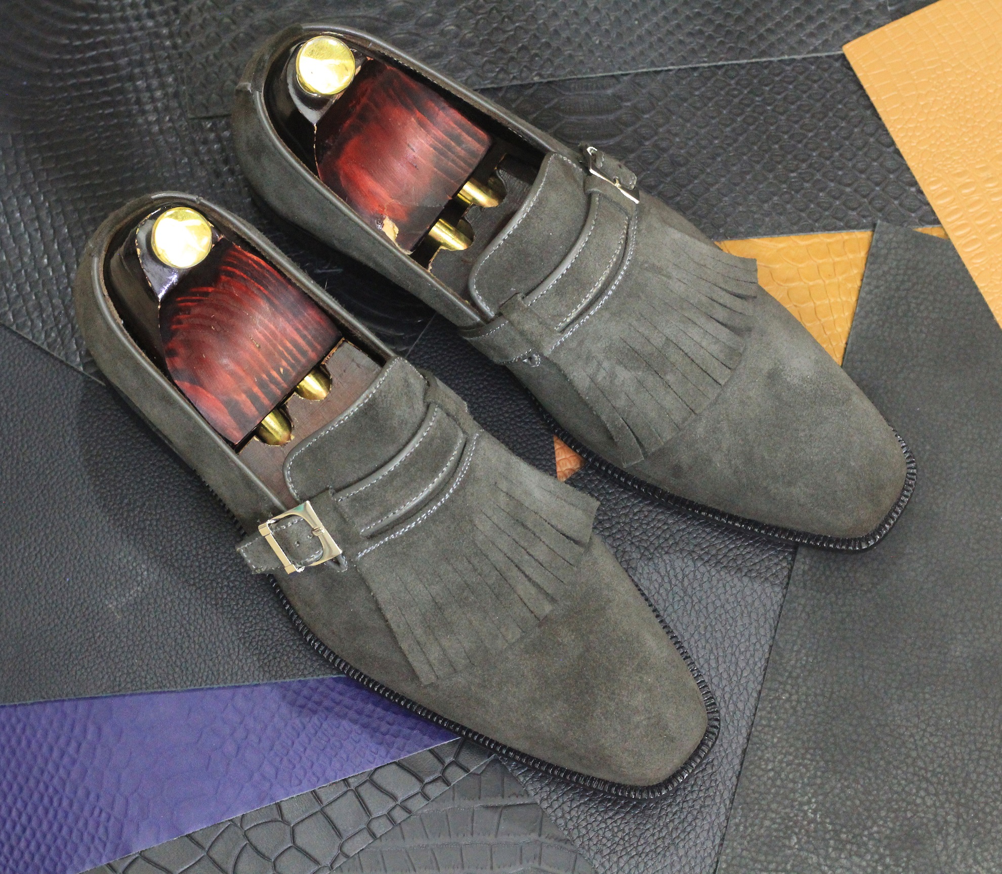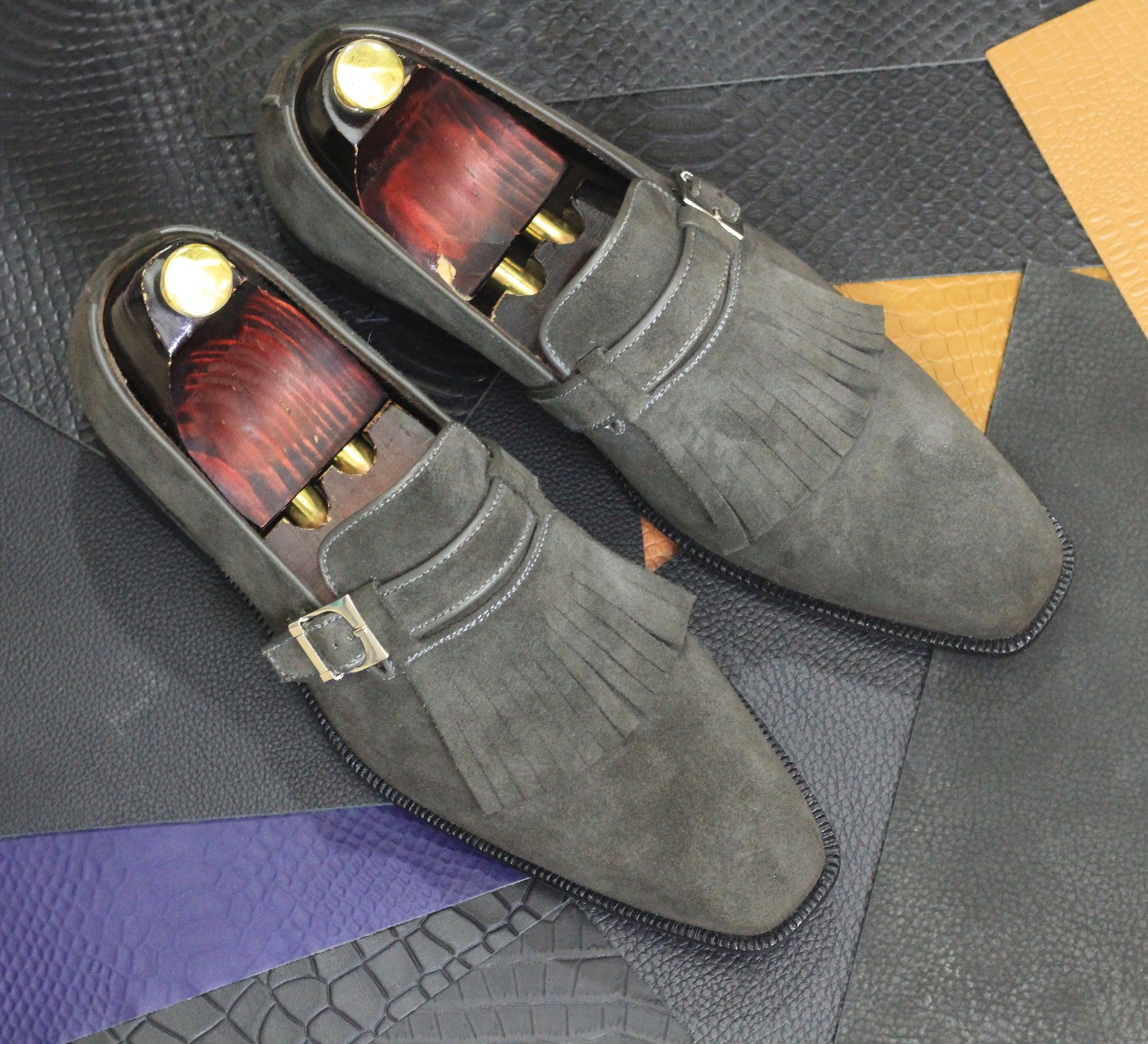 Men's Gray Suede Fringe Monk Strap Slip On Leather Loafer Shoes