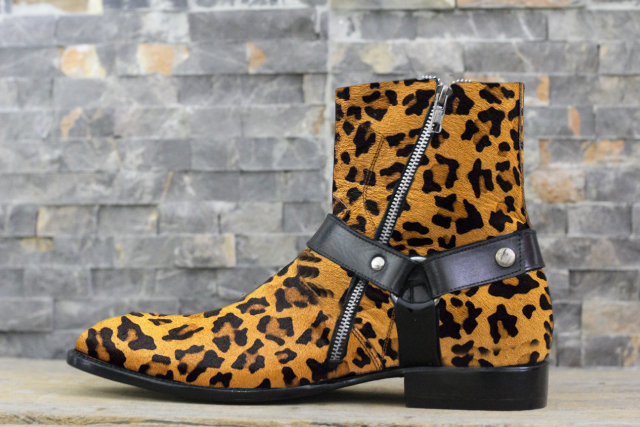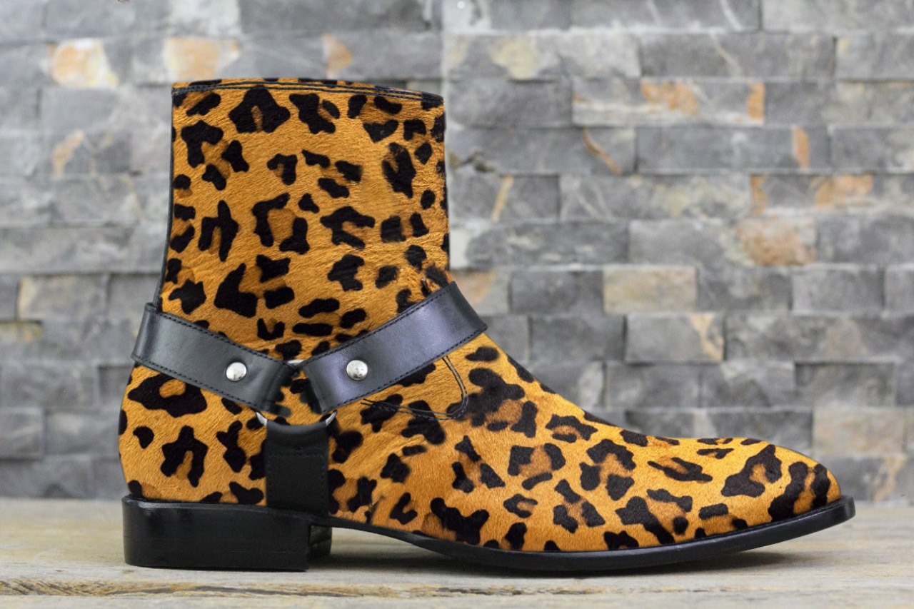 Men's Hand Crafted Leopard Skin Print Leather Boot, Ankle High Madrid Strap Harness Leather Boot