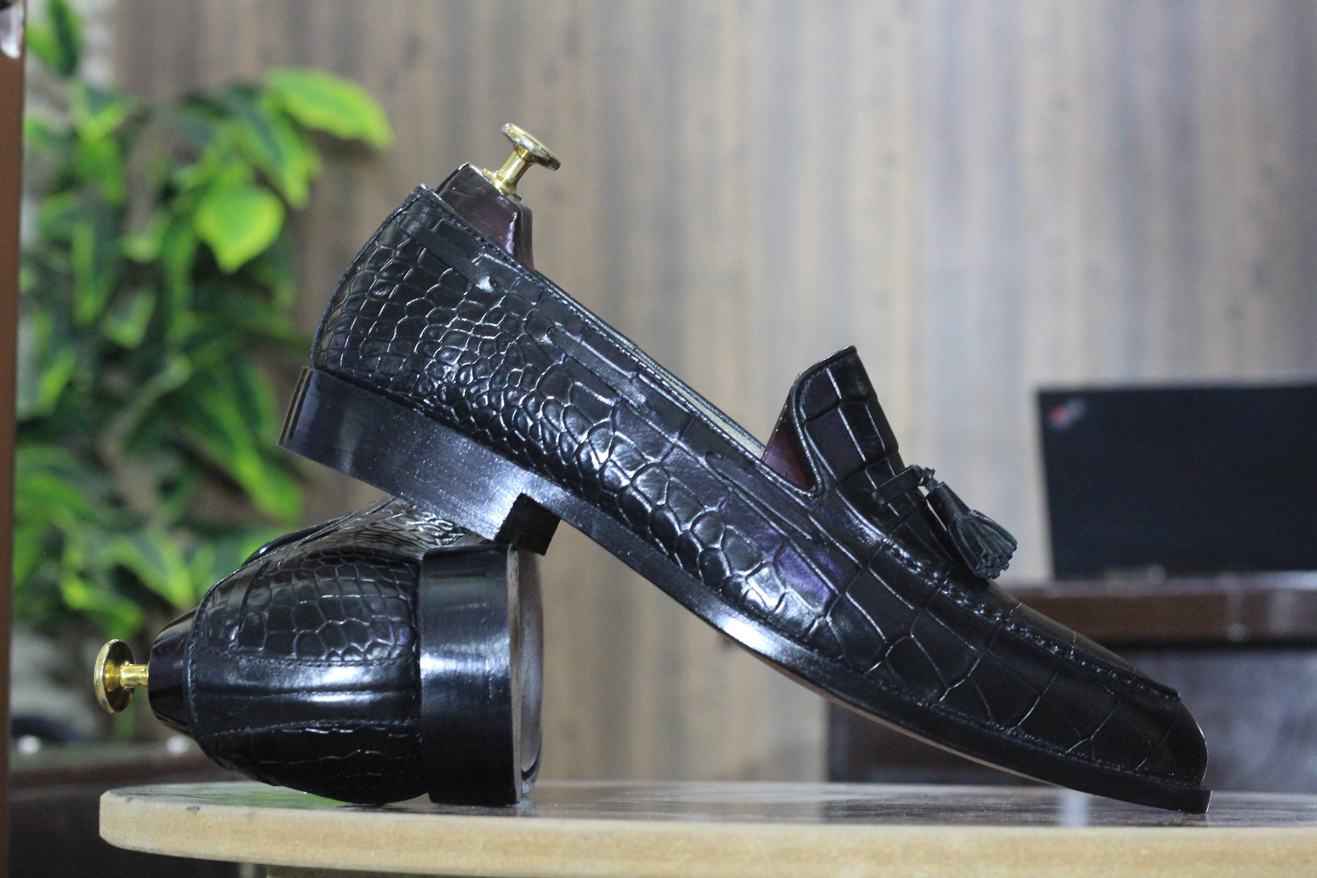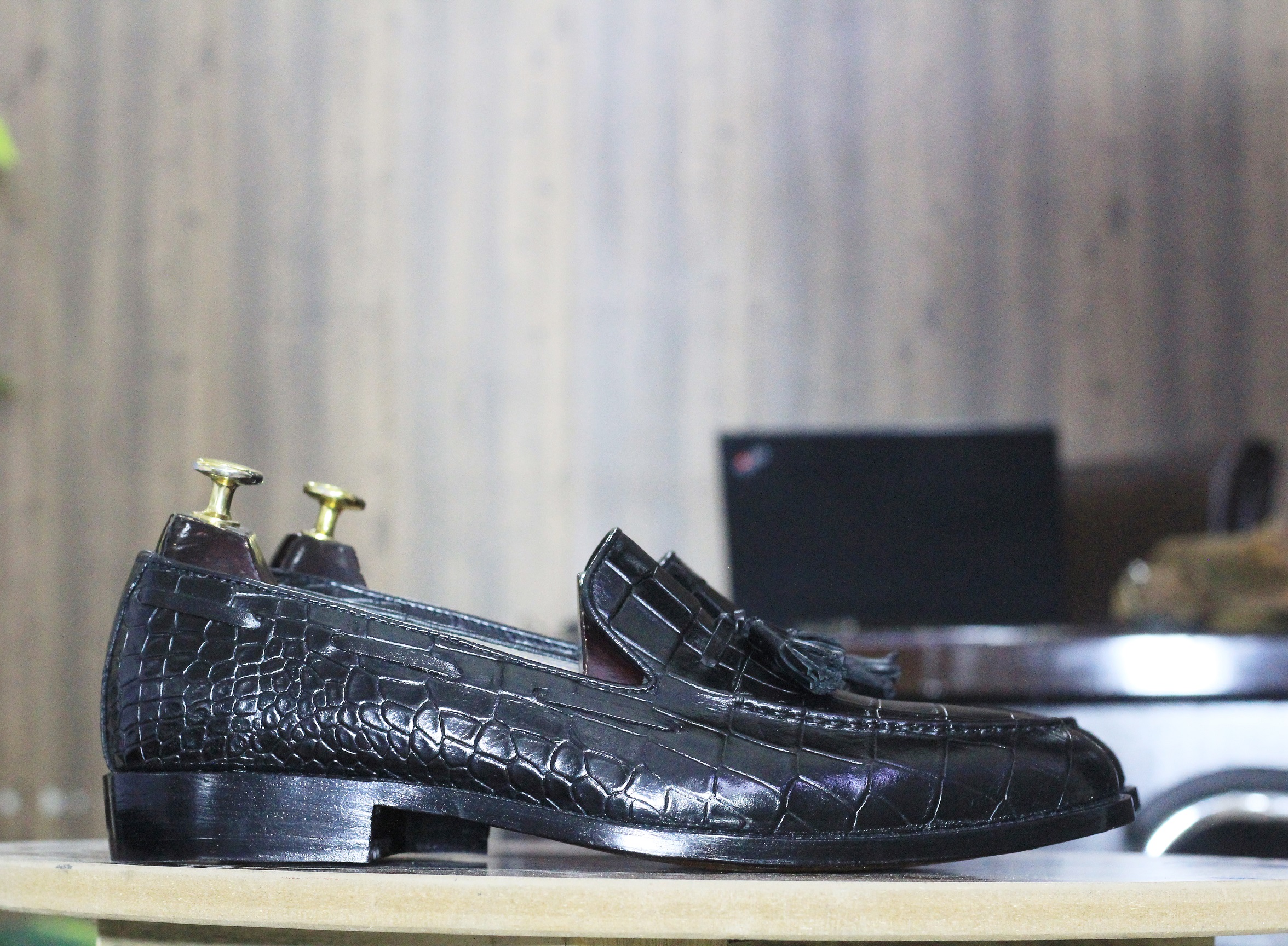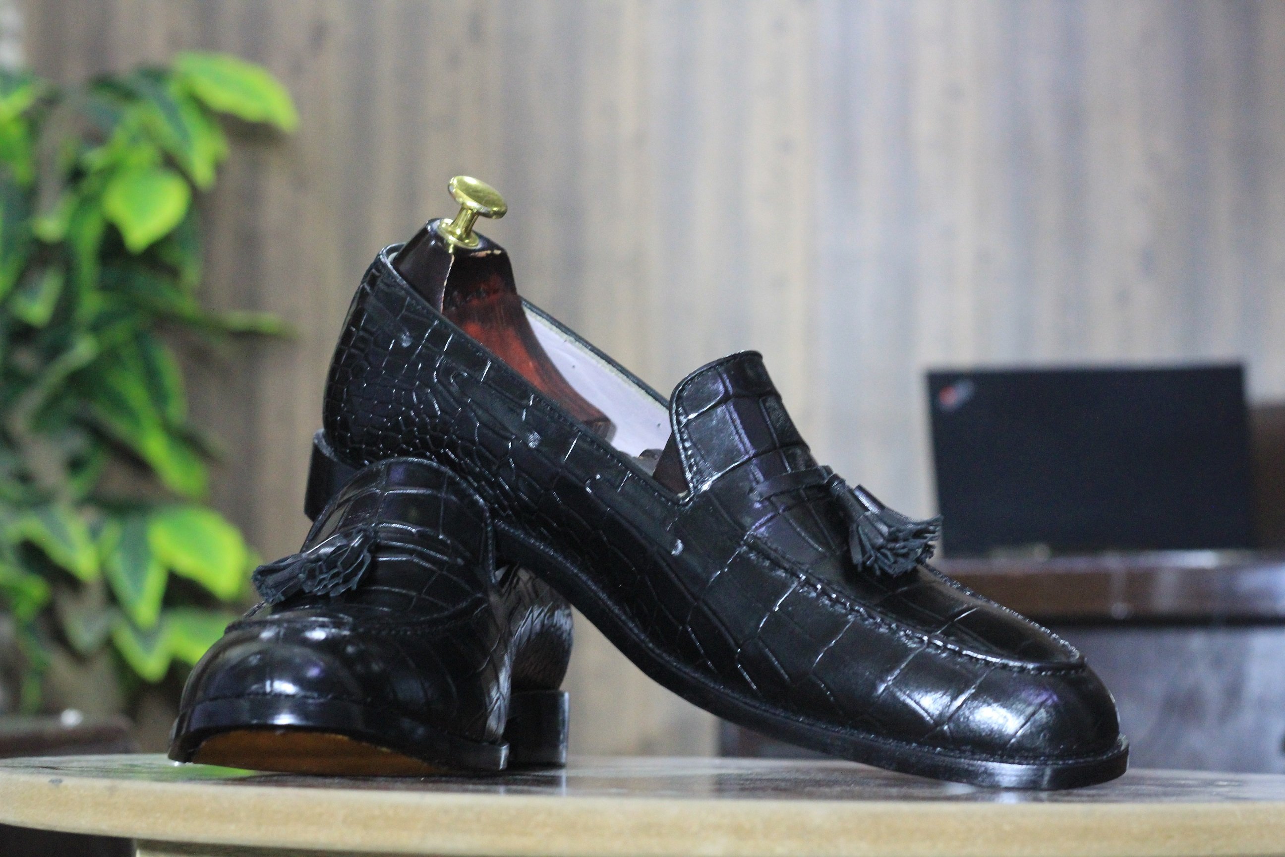 New Classic Pure Black Alligator Leather Shoes, Handmade Slip On Moccasin Loafer Tussle Shoes