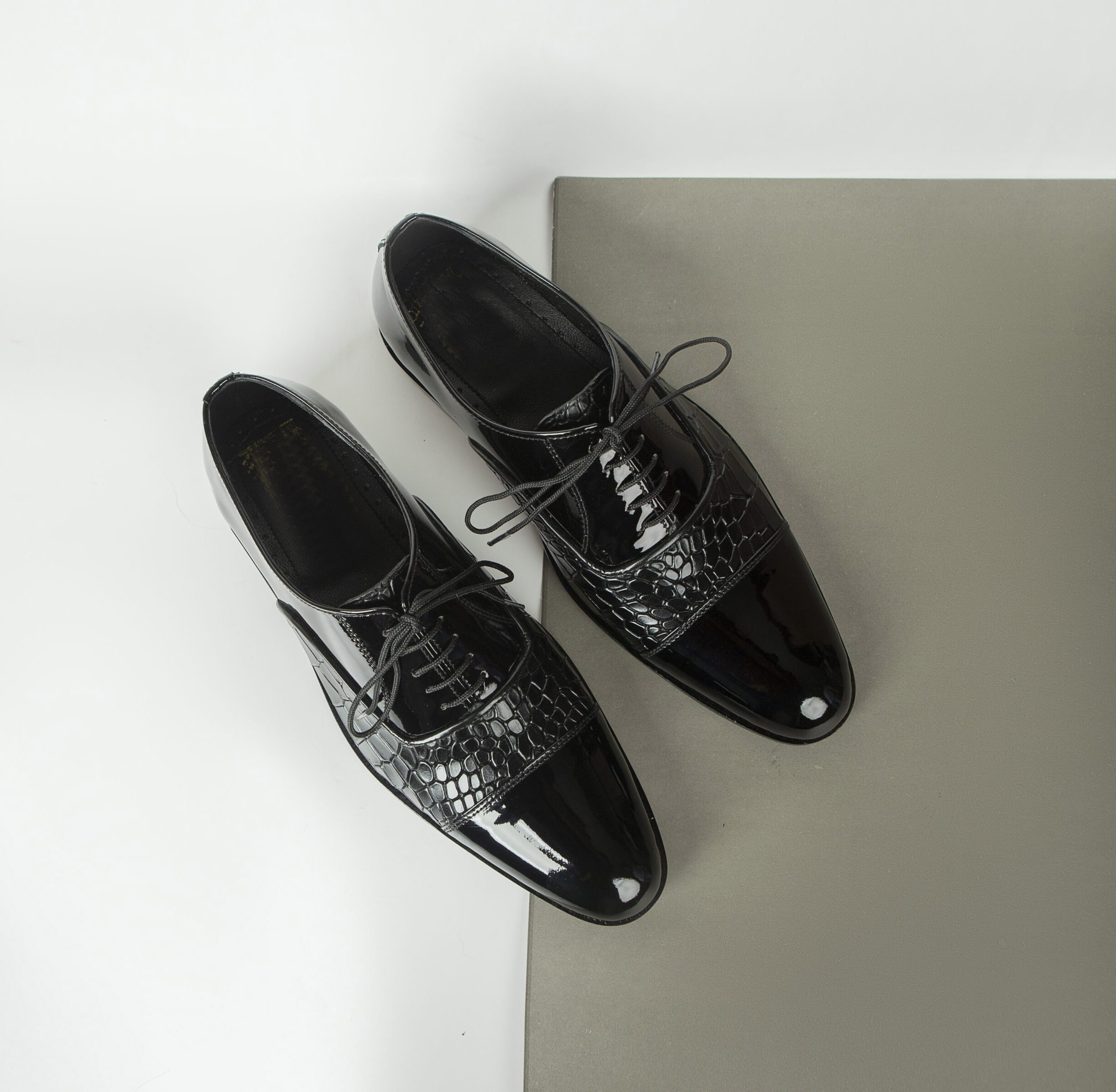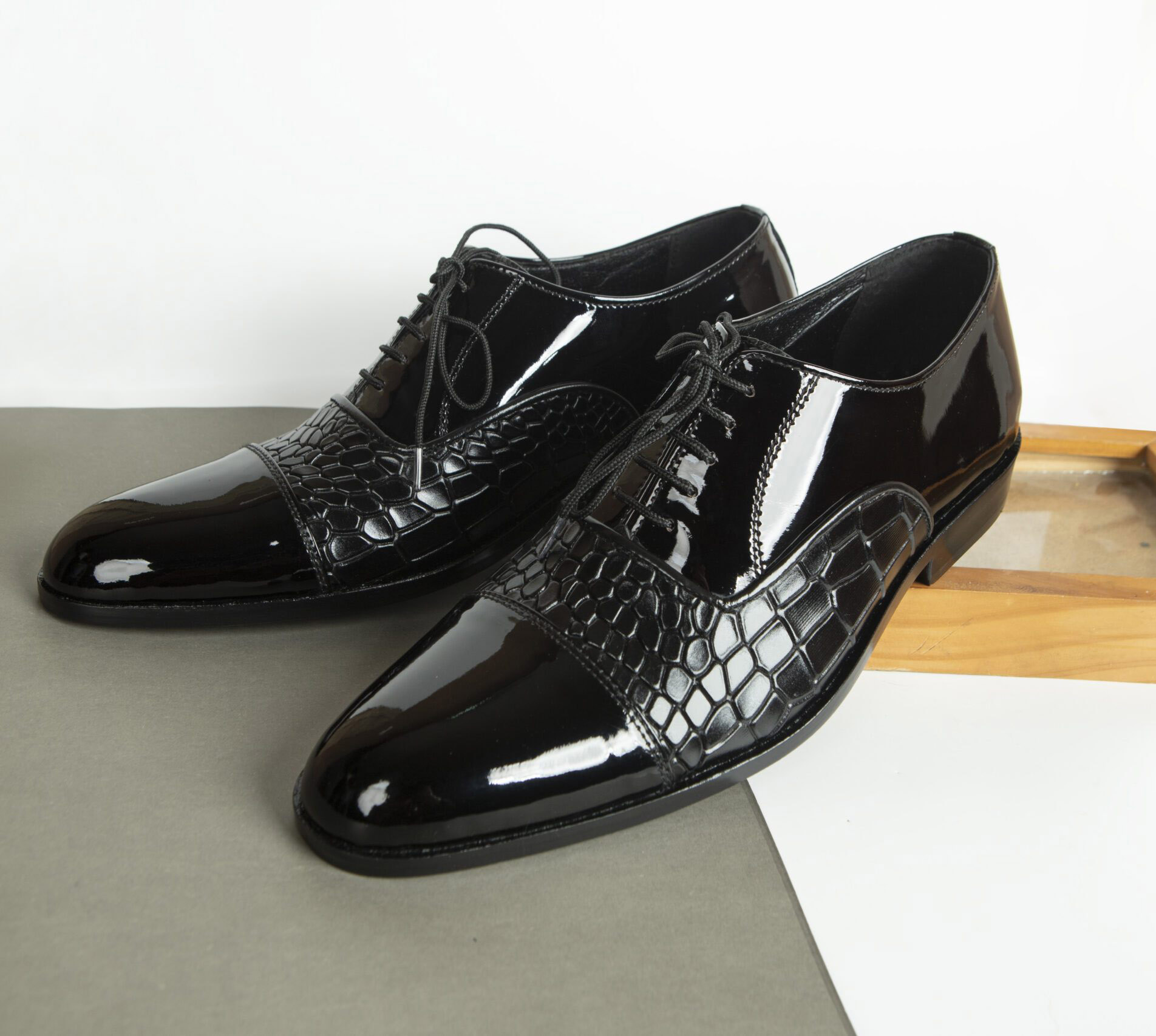 Men's Black Patent Print Leather Handmade Men's Alligator Lace Up Business Formal Shoes
