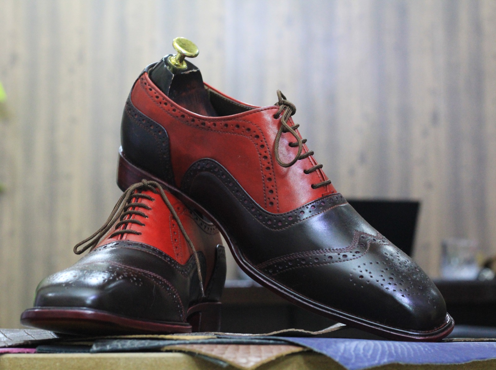Handmade Two Tone Lace Up Wing Tip Brogue Toe Pure Leather Shoes
