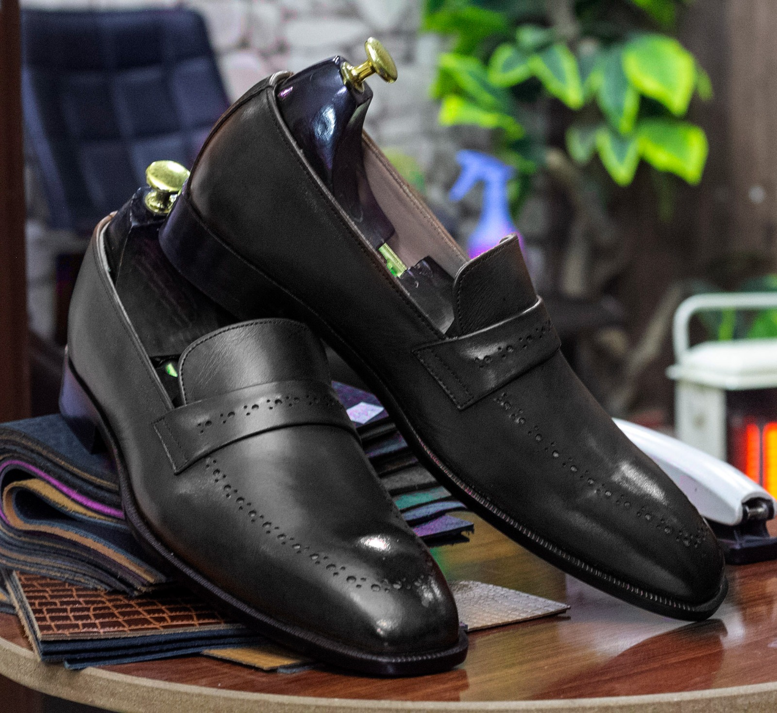 New Men's Black Oxford Leather Shoes, Hand Painted Penny Loafer Moccasin Shoes