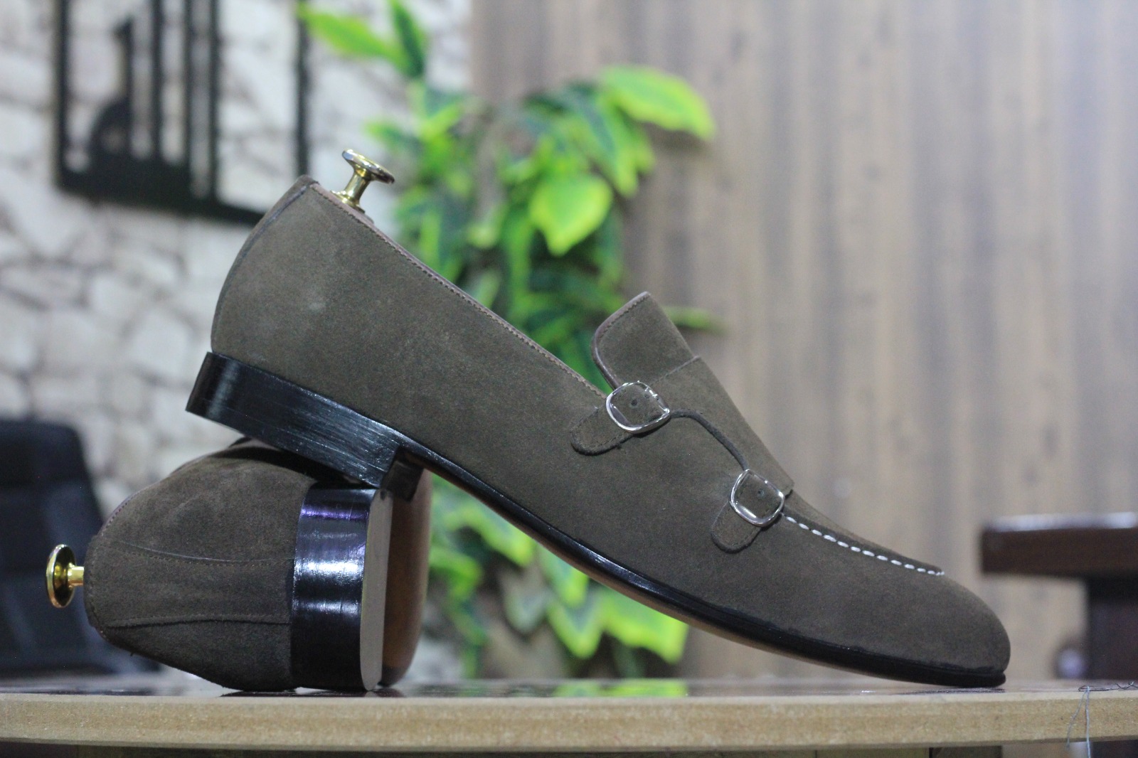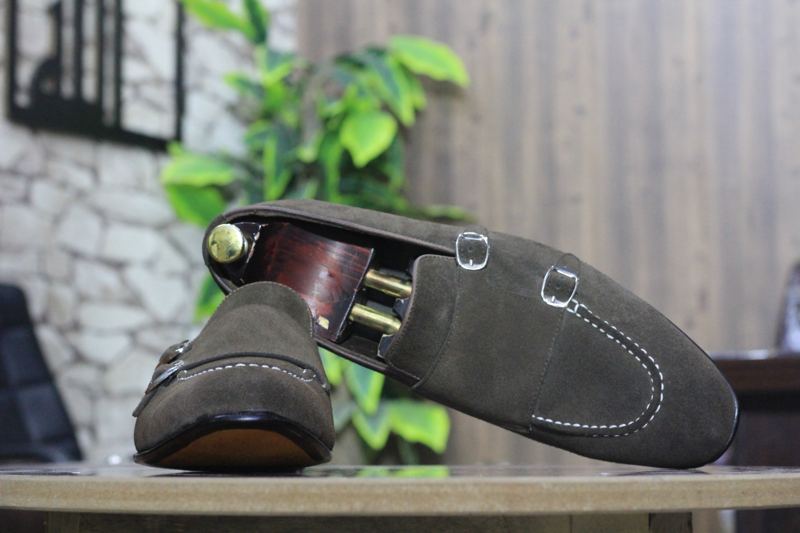 Men's Olive Green Double Buckle Suede Shoes, Oxford Shoes, Hand Painted Shoes