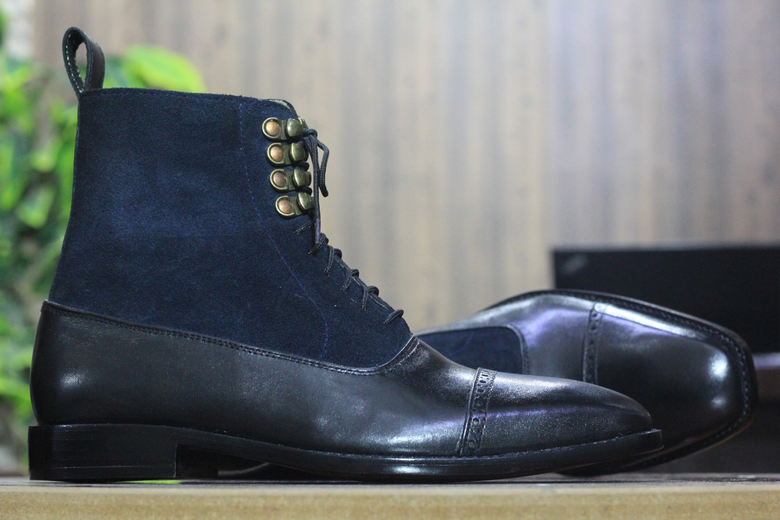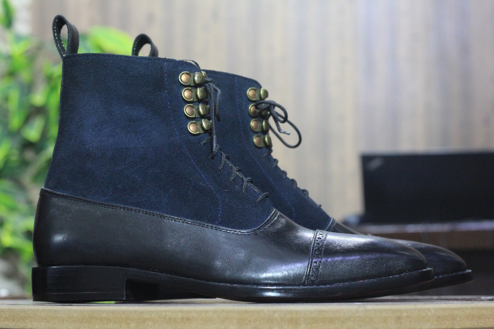 Ankle High Navy Blue Leather Suede Boot, Lace Up Boot For Men's