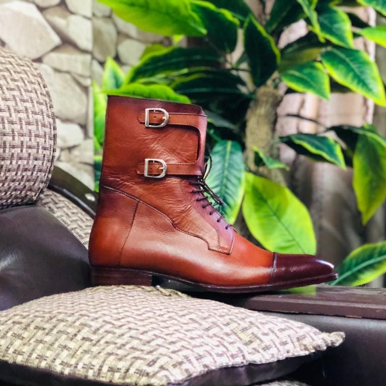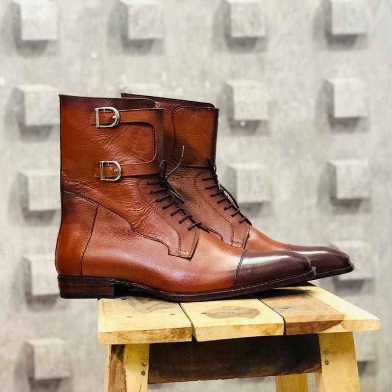 Ankle High Brown Lace Up Cap Toe Double Buckle Pure Handmade Leather Boot