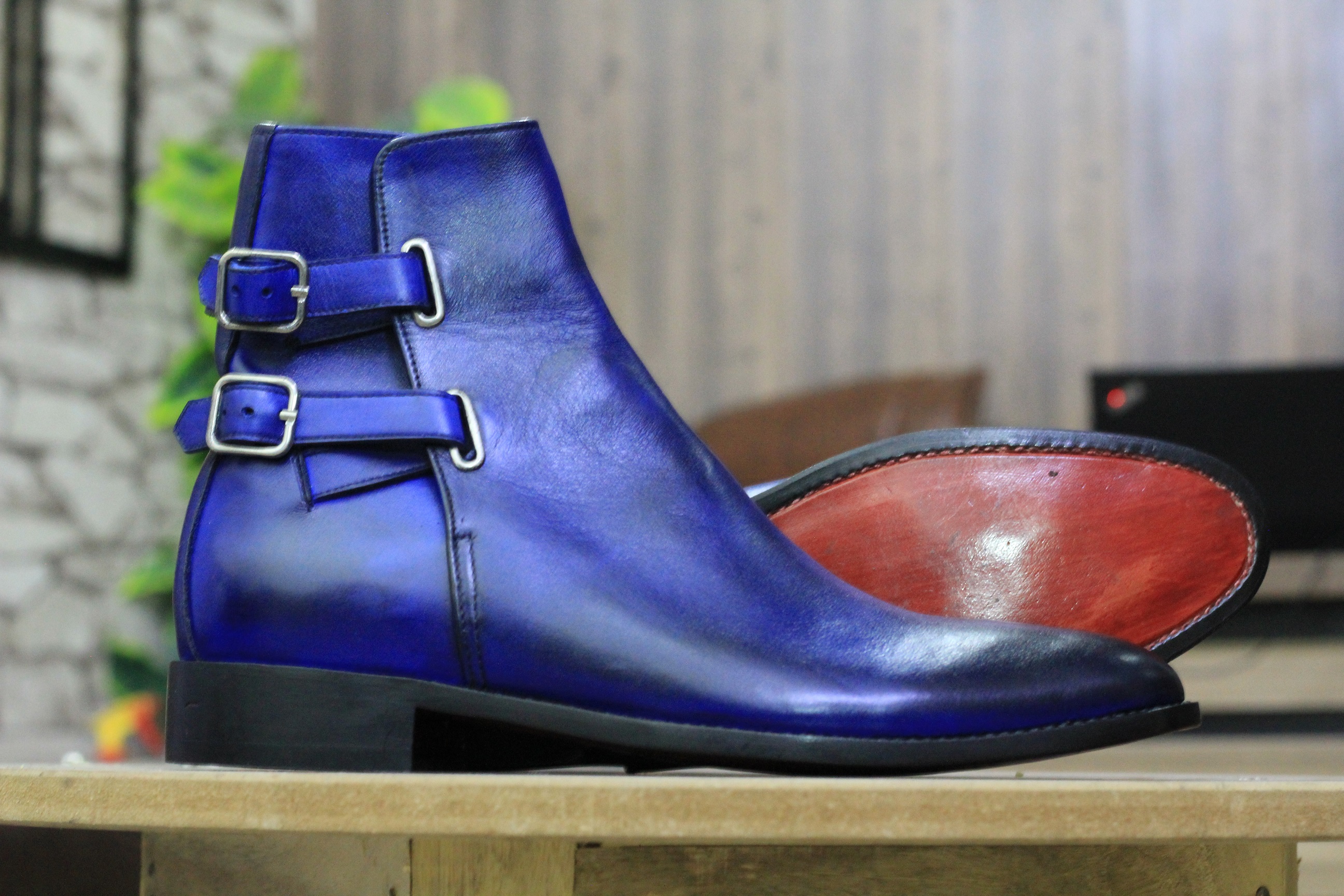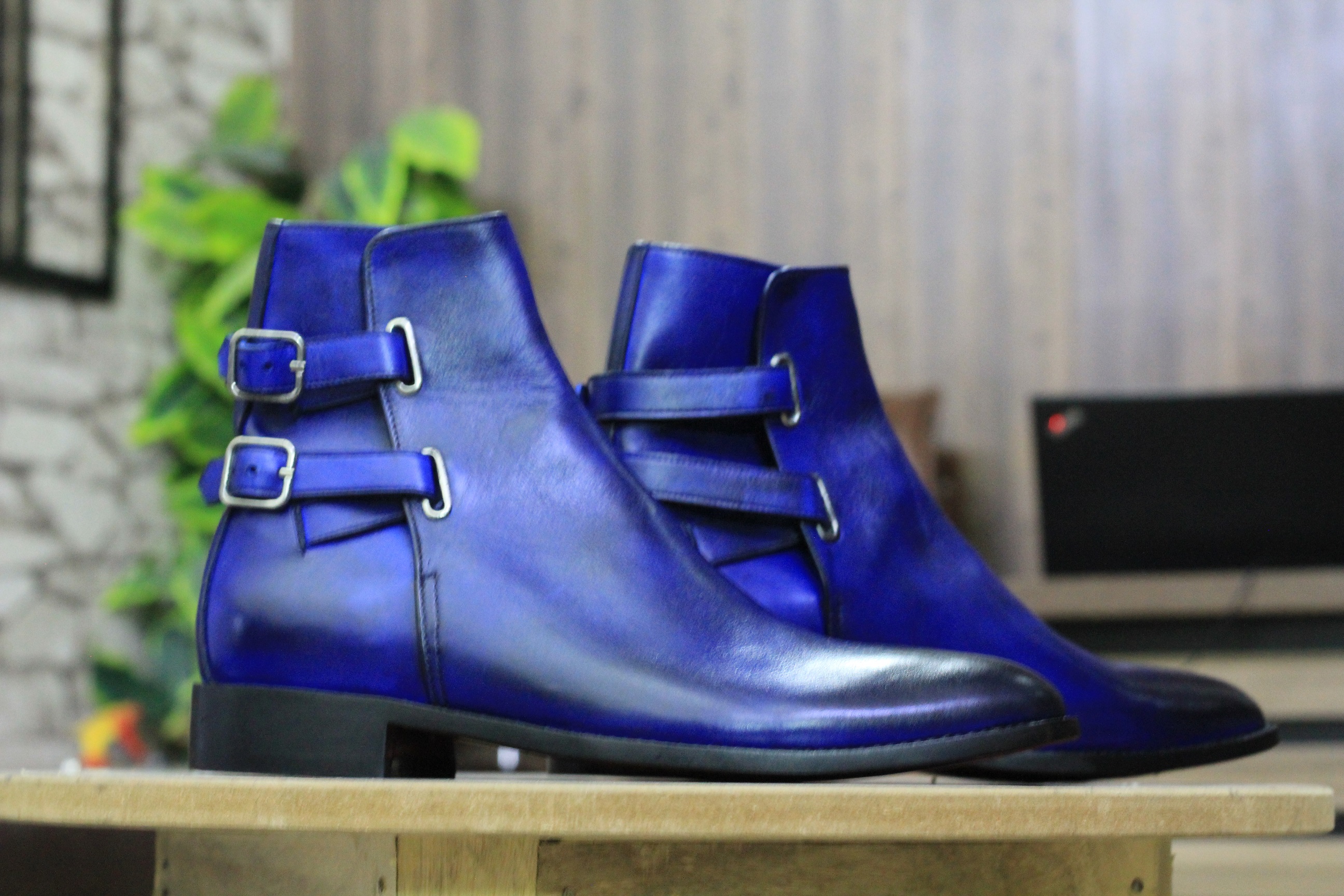 Handmade Blue Double Buckle Ankle High Boots, Men's Boot, Formal Wear Boot