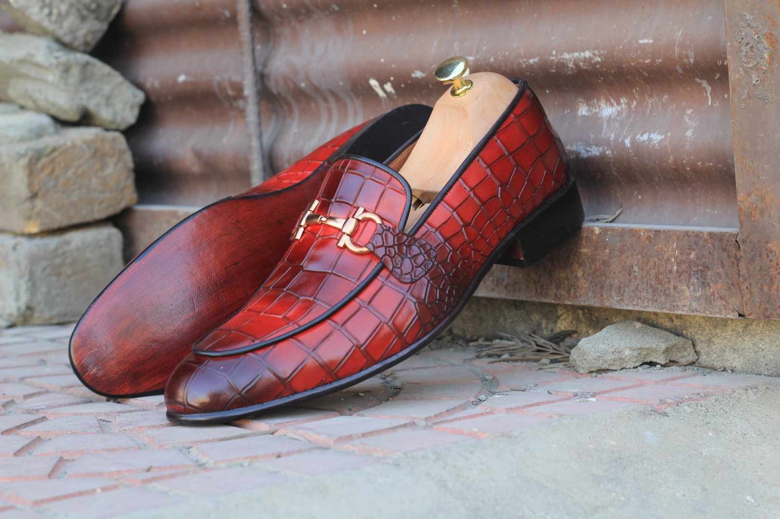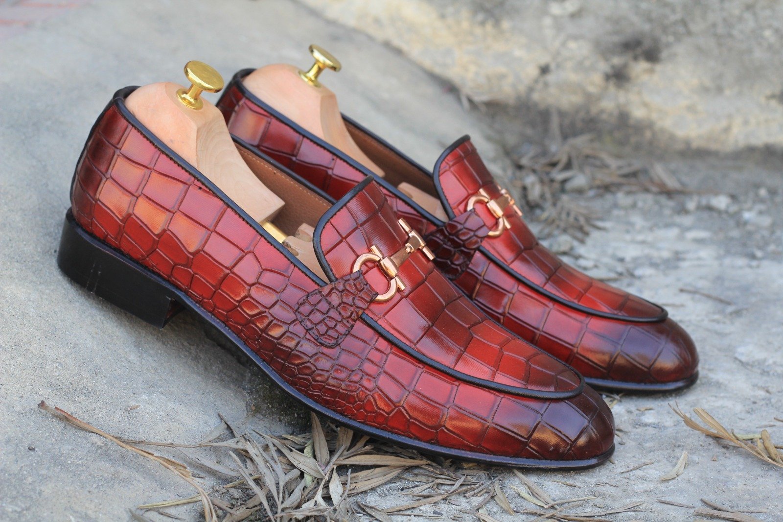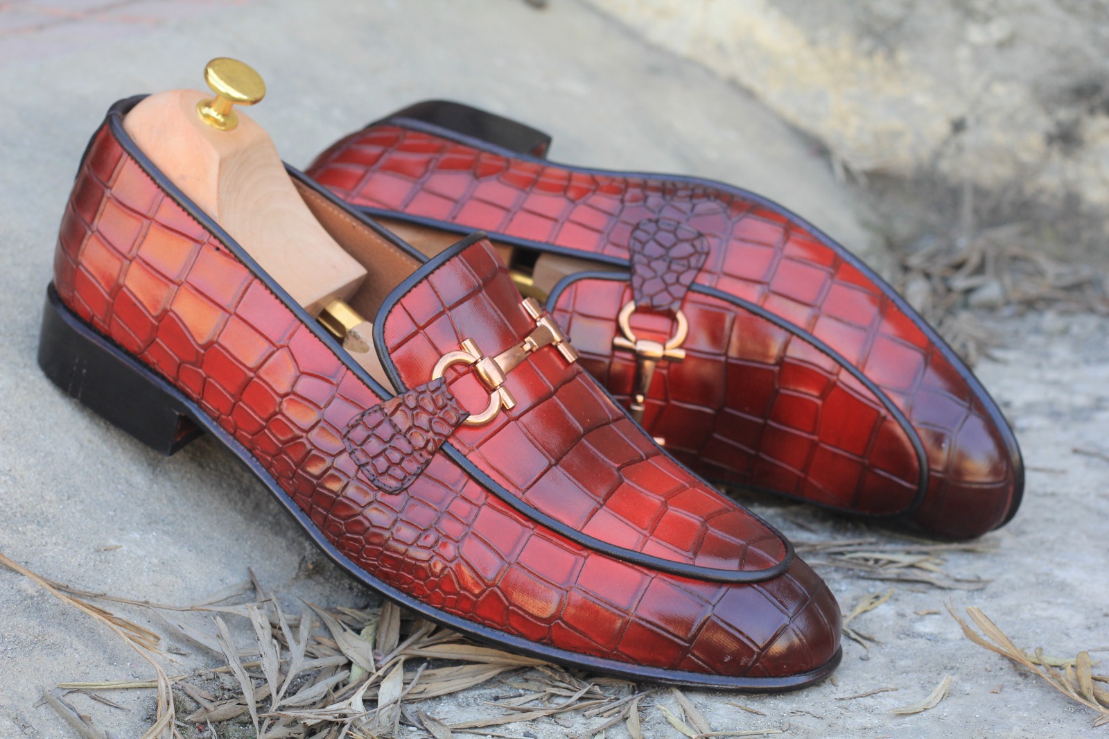 Men's Two Shaded Alligator Texture Shoes, Handmade Slip On Shoes, Horse bit Style Shoes