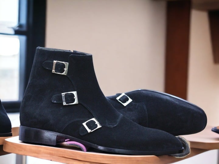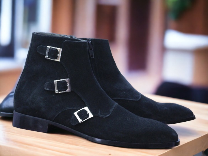 Men's Handmade Black Triple Buckle Boot Side Zipper Boot, Suede Fashion Boot